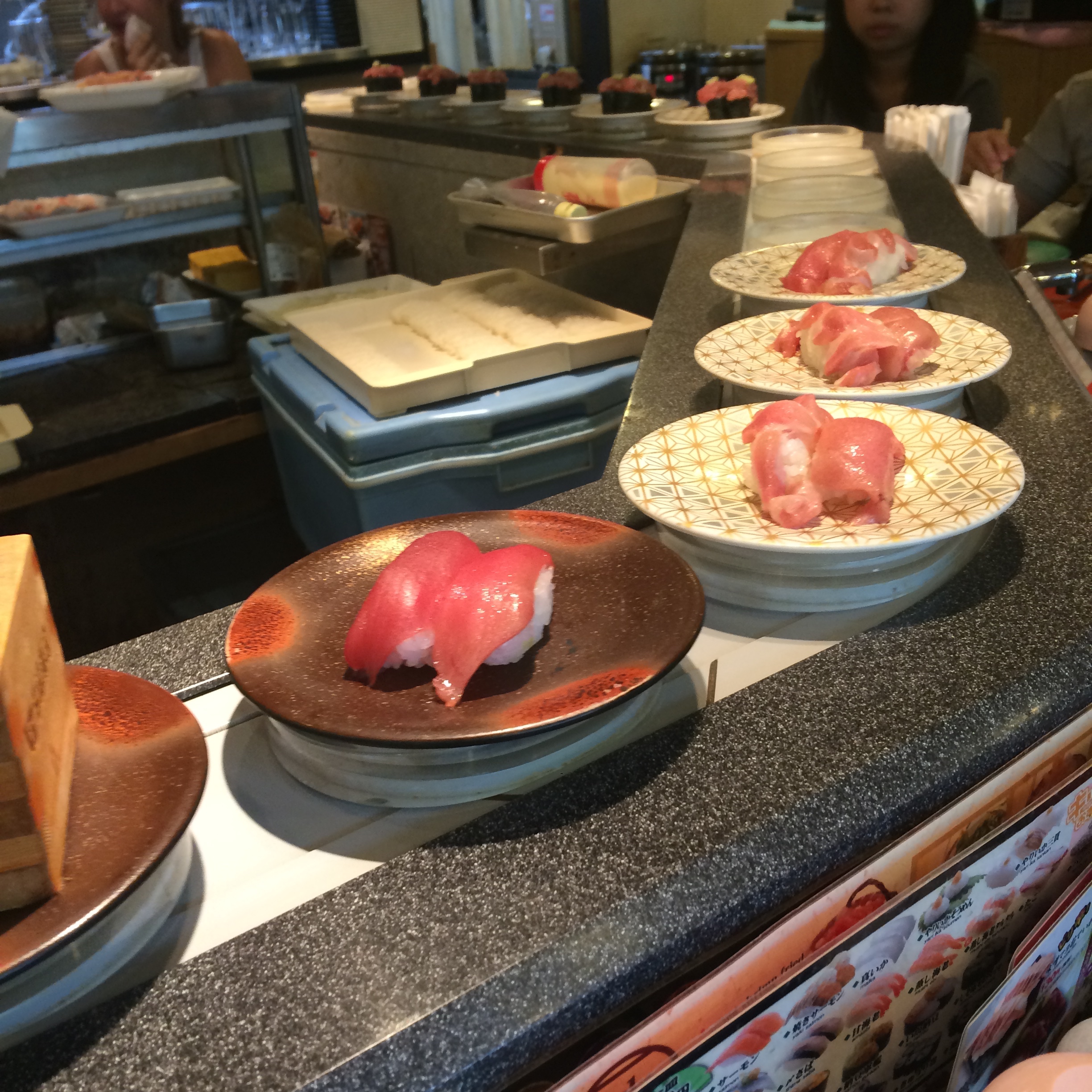 Sushi meals come in many shapes and sizes here in Tokyo, and I can pretty much guarantee that no matter which place, style, etc., you choose it will be better than the sushi you’ve had back in the states. This week I’ve had 4 sushi meals: 3 serious sit-down (totaling 3 Michelin stars), and 1 of the pop-in conveyer-belt variety (not to mention the delicious sushi breakfast at Daiwa last week that I already covered). Conveyer belt is always fun, of course, but I’m going to focus on the serious sit-down meals.