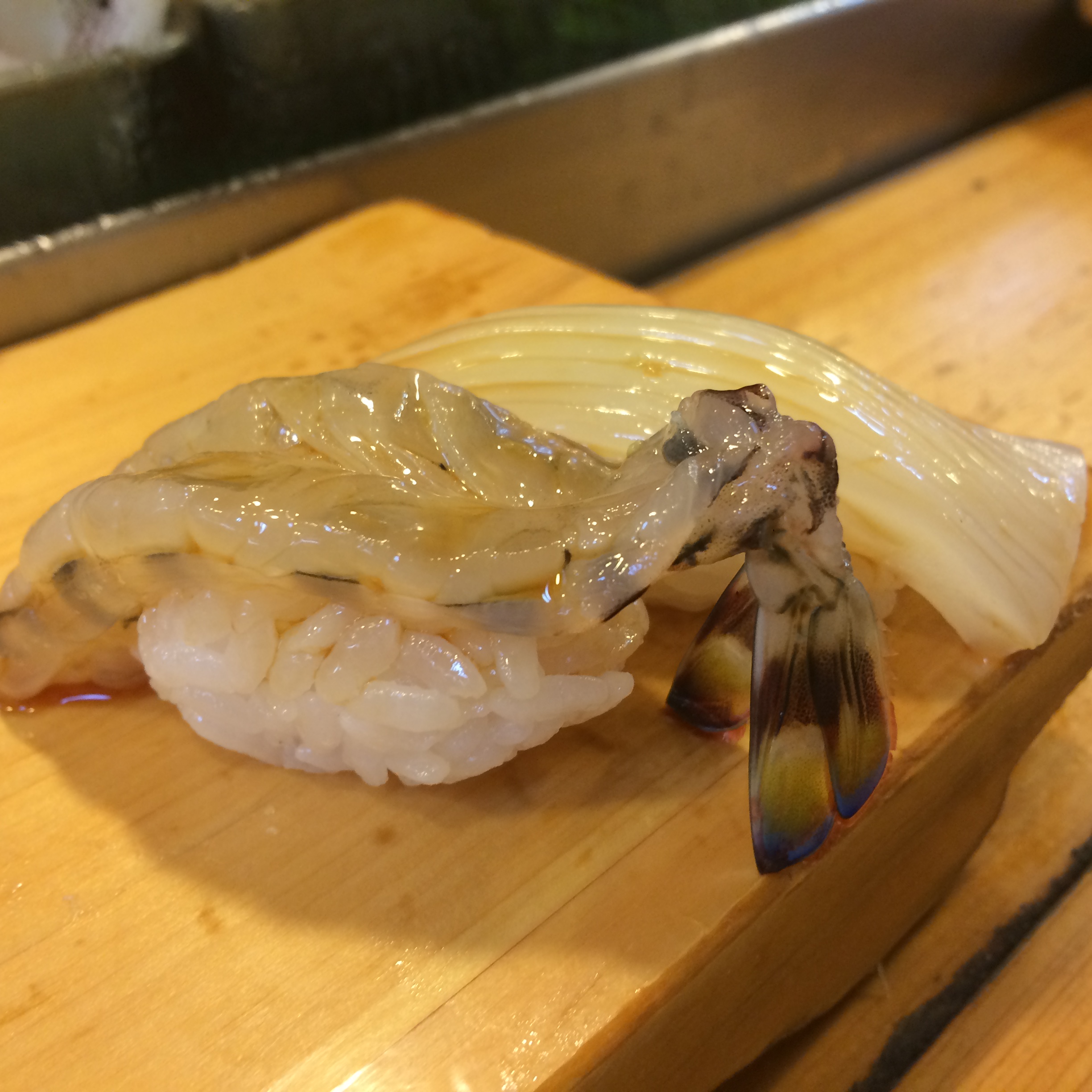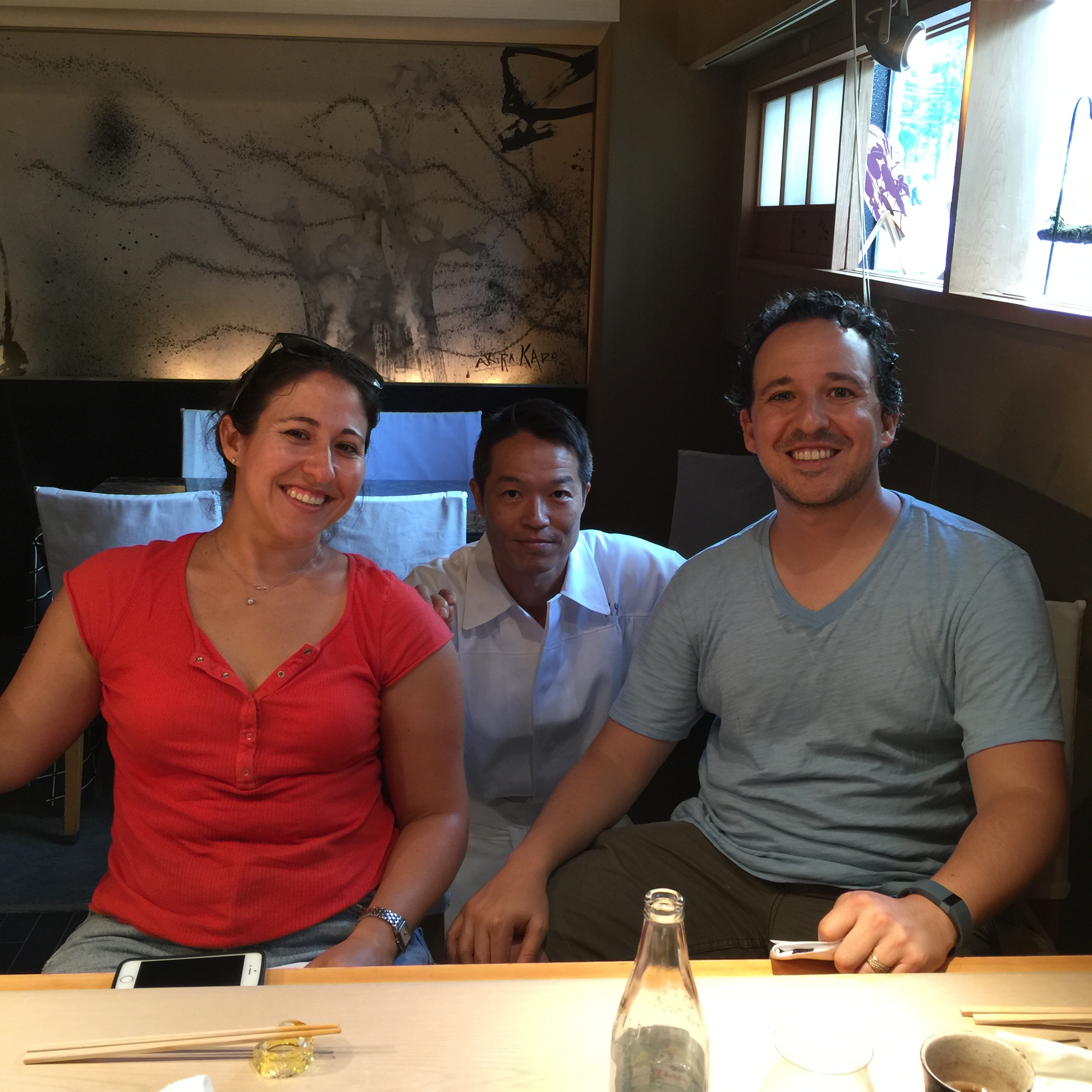 The translation for many of the fish was difficult, so a few pieces of sushi go unaccounted for, but Chef Tsunoda was able to communicate the majority of them. We had sea bream, white shrimp, tuna, toro, mackerel, an awesome scallop which had been tenderized, a fresh shrimp, scallop maki (rolled in seaweed), fantastically fresh uni flown in that morning, a local species of clam, anago (sea eel), and tamago. We ordered 2 different sakes, chef’s choice, and were served the same one that we loved at our kaiseki meal in Kyoto – Kamoshibito Kuheiji. We couldn’t believe our luck because we had been talking about it for days since we first had it!!