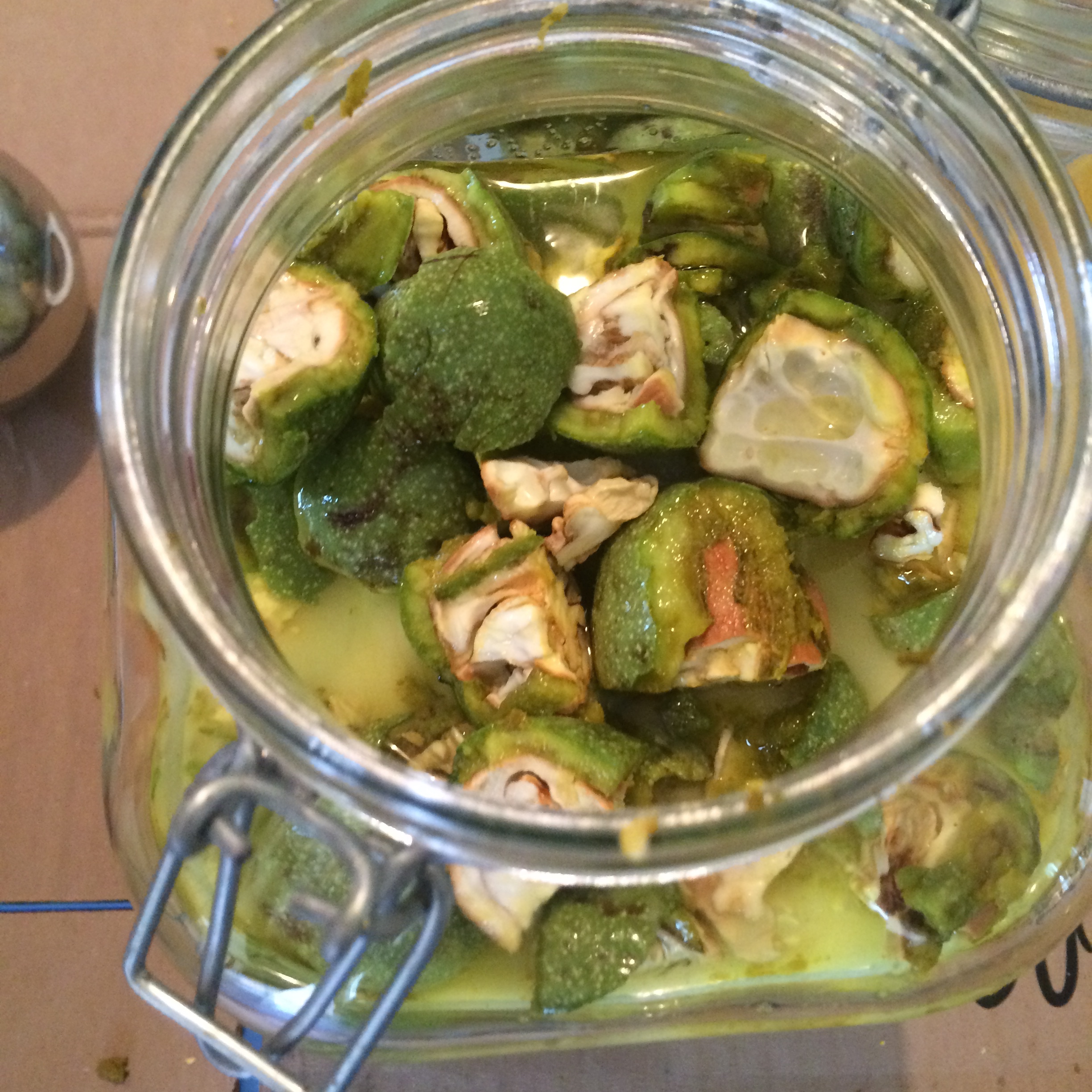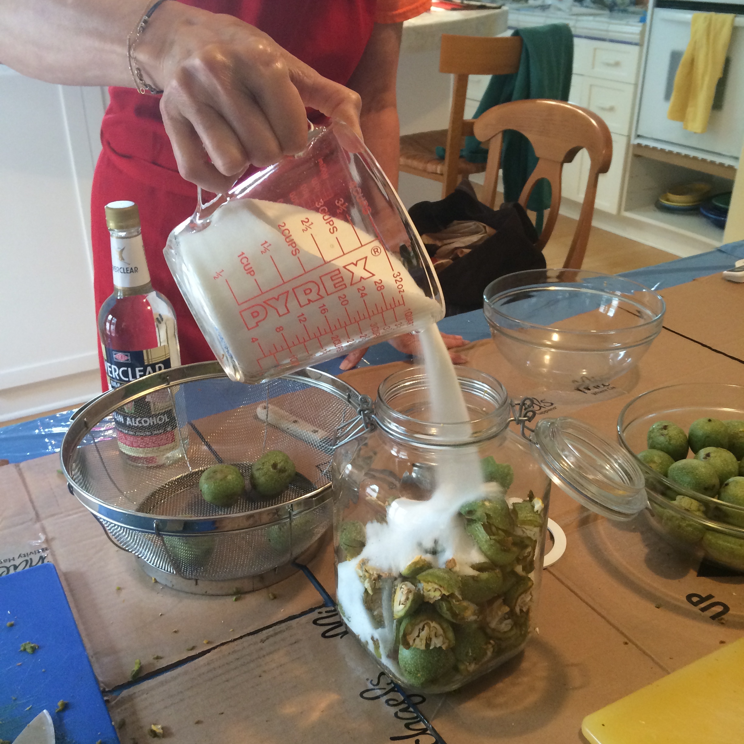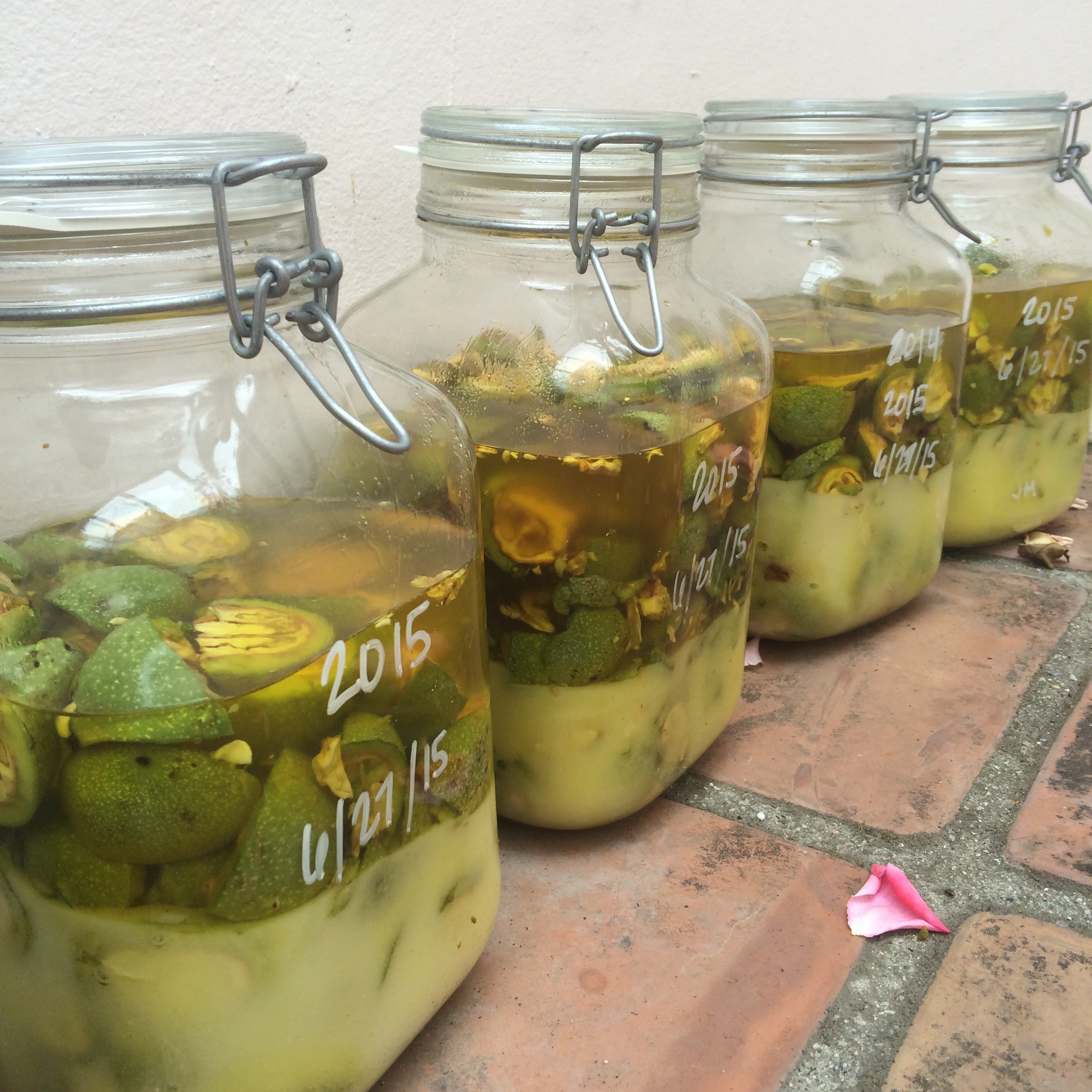For the past few years my friends at D.O.P Kitchen have made their own nocino in Los Angeles and I have been lucky enough to be able to join in the process a couple of times. We started the batch for 2015 last week. Nocino needs 6 months to sit in the sun before it’s ready to drink, so, in June, around the summer solstice, green walnuts are harvested, chopped and quartered, and combined with sugar and grain alcohol (Note: green walnuts are just unripe walnuts). Some add spices to their nocino mixture, but we learned from our friends at Bluone who are natives to Emilia Romagna and therefore who would never add anything to their walnuts…I guess if it ain’t broke, right?!