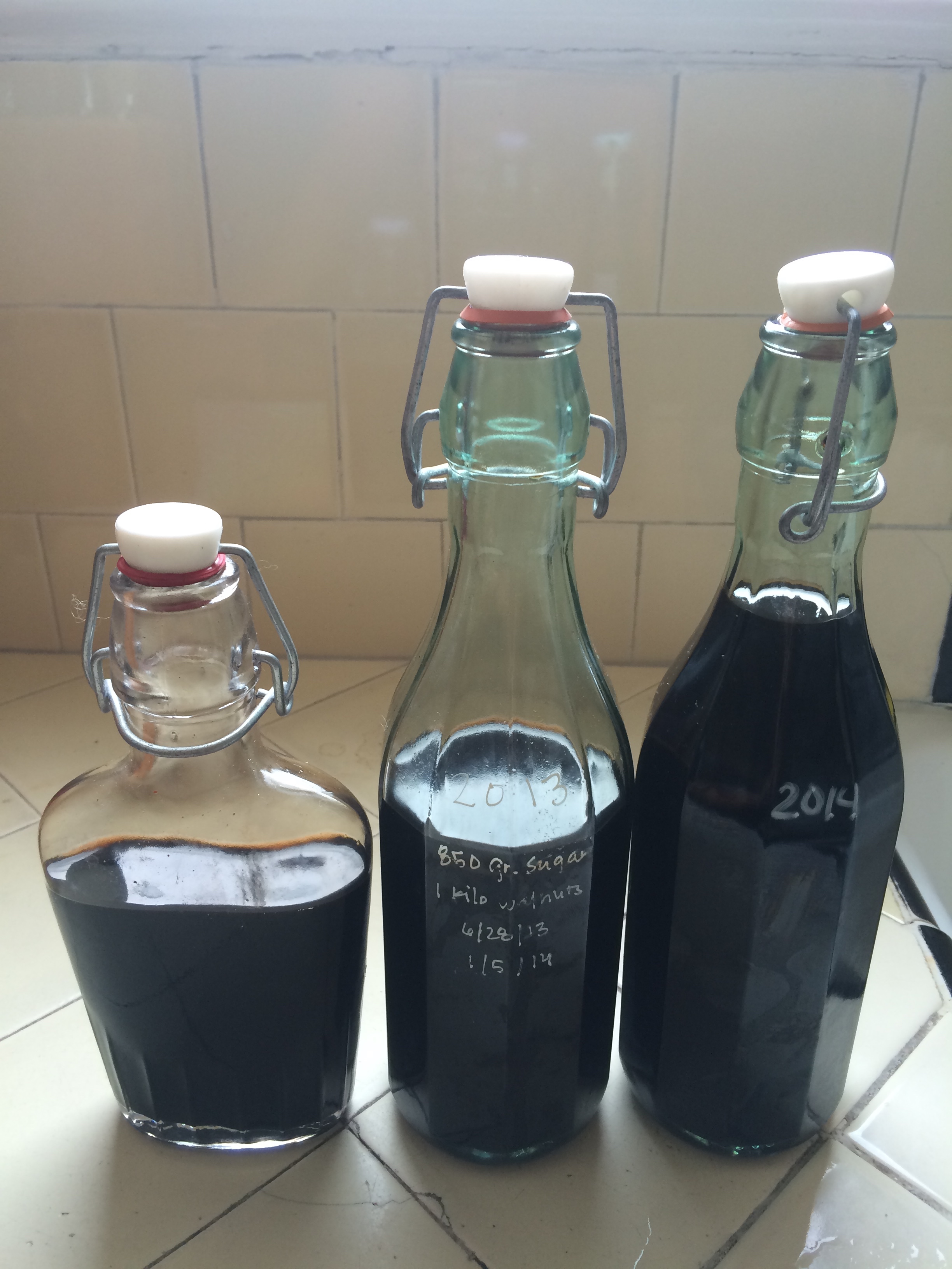 As you can see, the green walnut/sugar/alcohol mixture is clear in June, but by December when it is decanted it is a somewhat thick, dark brown liqueur. I have all 3 vintages of D.O.P Nocino: 2012, 2013 & 2014 in my liquor cabinet at home and when 2015 is ready at the end of the year, I will be doing a tasting/flight for myself…and anyone else who wants to partake. I think the 2012 will be perfect to pour over some ice cream while the 2014 and 2015 will be great to keep sipping on…but I’ll have to let you know for sure in January. Until then, if you happen to see Nocino on a menu, give it a try, I don’t think you will be disappointed!