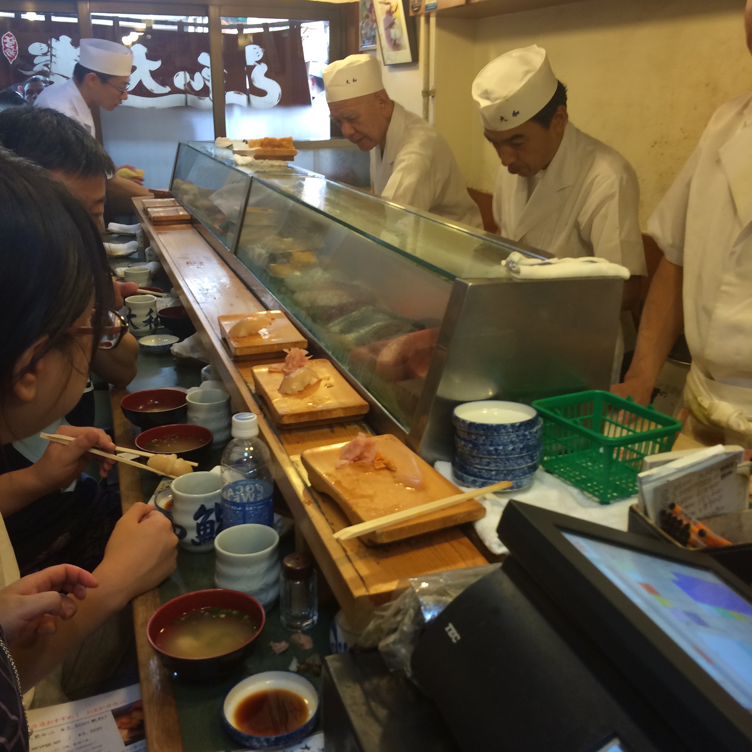 At a slightly more normal breakfast hour we hit up Tsujiki Market for breakfast sushi, instead of the early-morning auction. Hoping to capitalize on the heat and the fact that less people seem to be out and about, we got to the market at around 9 and got in line for Sushi Daiwa. The alleys of the fish market are jampacked with small restaurants serving all sorts of Japanese cuisine. We were eating 30 minutes later, inside at a 10-seat sushi bar. We each ordered “the set” and the sushi began rapidly appearing on my plate. I had heard that many of these sushi meals are very quick, and I wasn’t sure if I had to keep up with the pace of the chef in order to stay in his good graces, but after a couple of pieces I found my groove and stopped rushing.
