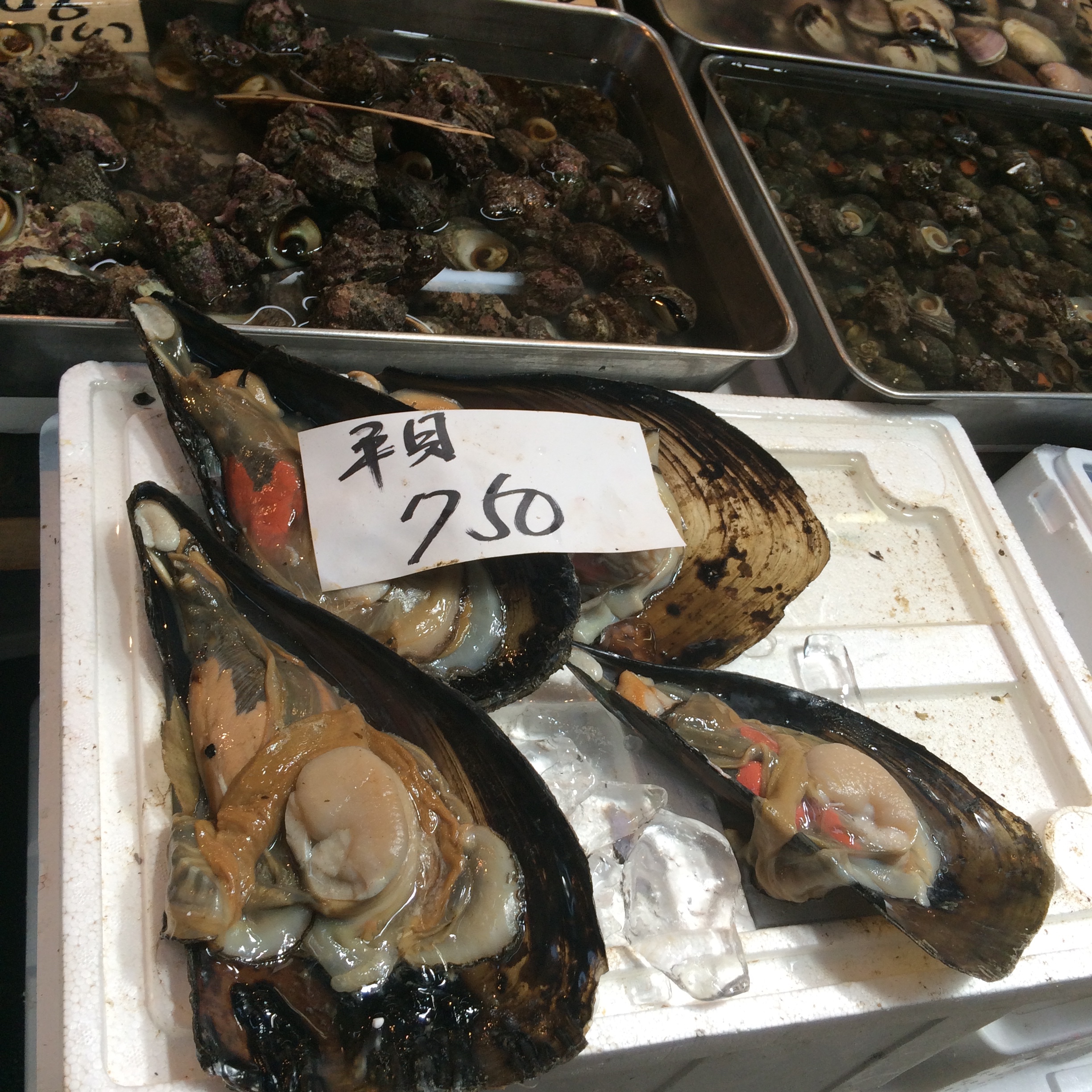 I tried a bunch of different pickled vegetables, some of which were pickled using rice bran to ferment – really strong! I had little round savory donuts filled with octopus (just eh), an amazing yuzu flavored mochi as well as a great black sesame one (which I ate that night), an octopus with a hardboiled egg stuffed in it’s head, a salted cucumber on a stick, and soy-milk doughnuts.  Plus, I bought black sesame covered peanuts and wasabi covered peanuts and almonds. The wasabi nuts were especially different from any wasabi snacks I’ve ever had – and now I can’t find anything similar elsewhere and I’m craving them, I wish we bought more!! The market is also full of fish, produce, and other Japanese crafts and items – it’s a one stop shop.