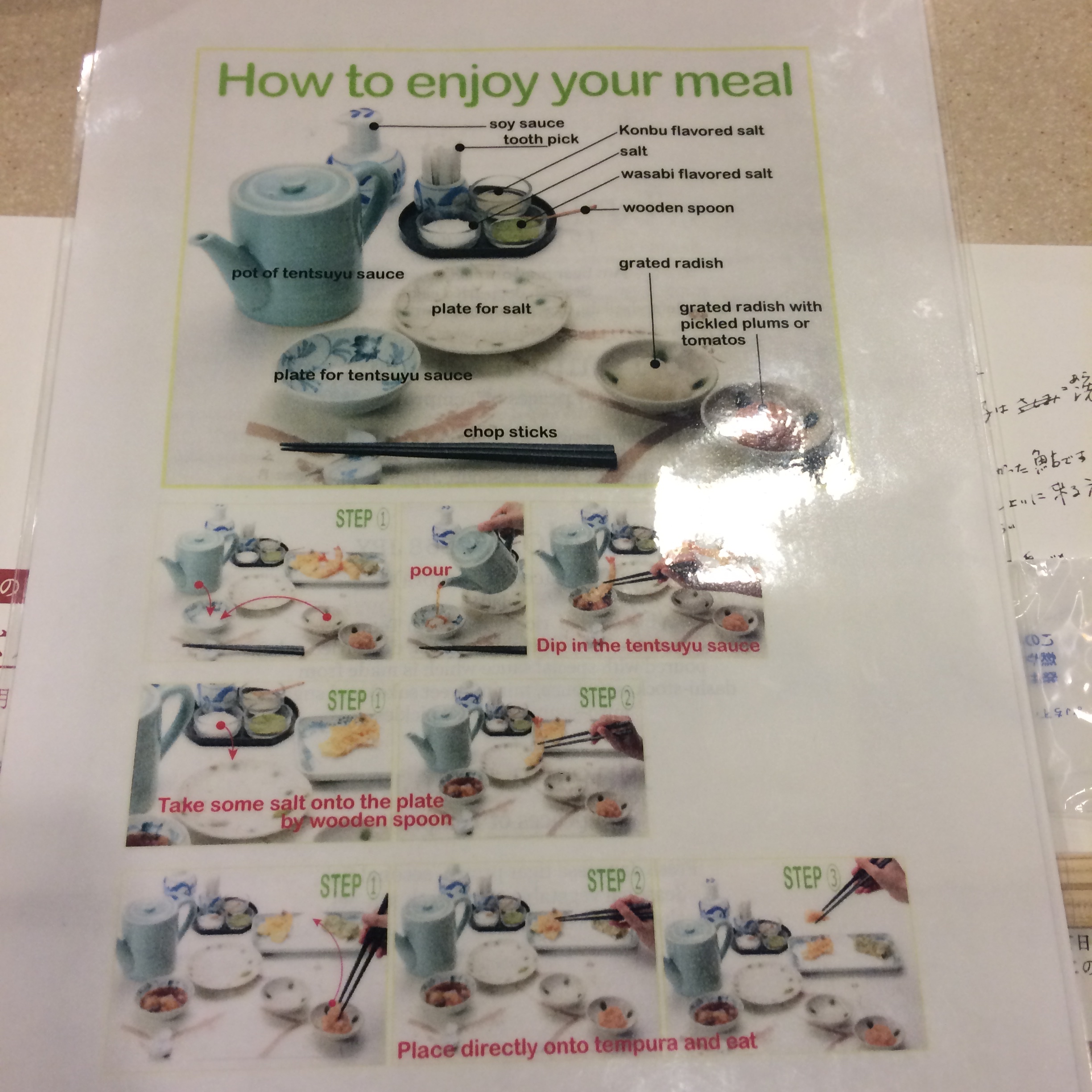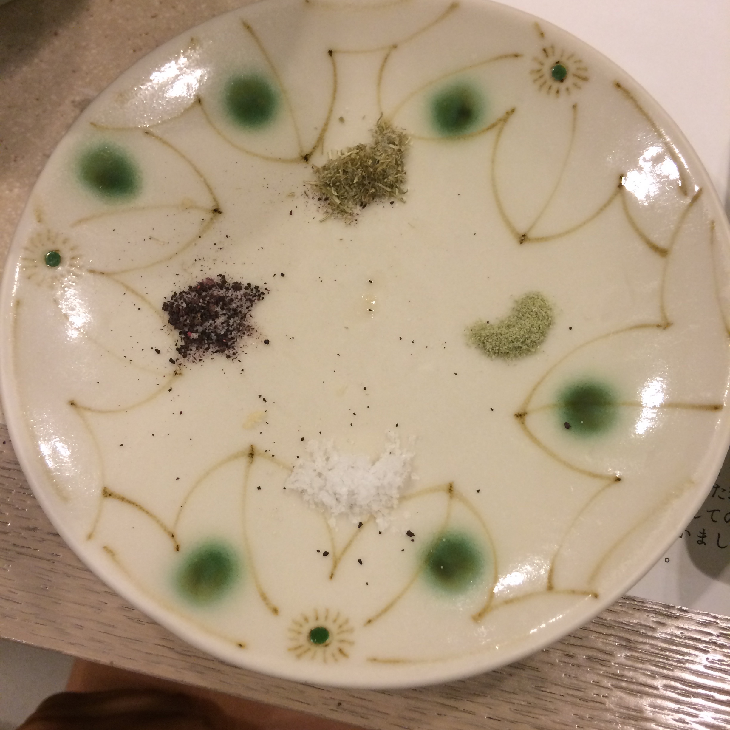 The back of our menus had a handy guide to the proper way to eat tempura. The 4 salts on the side of the table (regular, unclear what the purple one was, wasabi and konbu) are one potential method of seasoning and enjoying your tempura. As soon as I tasted the wasabi salt, all bets were off. I started putting it on everything – my rice, in the gazpacho shot they served with the meal…it really just makes anything taste amazing! (In fact, I’m eating eggs right now and just commented that wasabi salt would be a game changer if we had it).