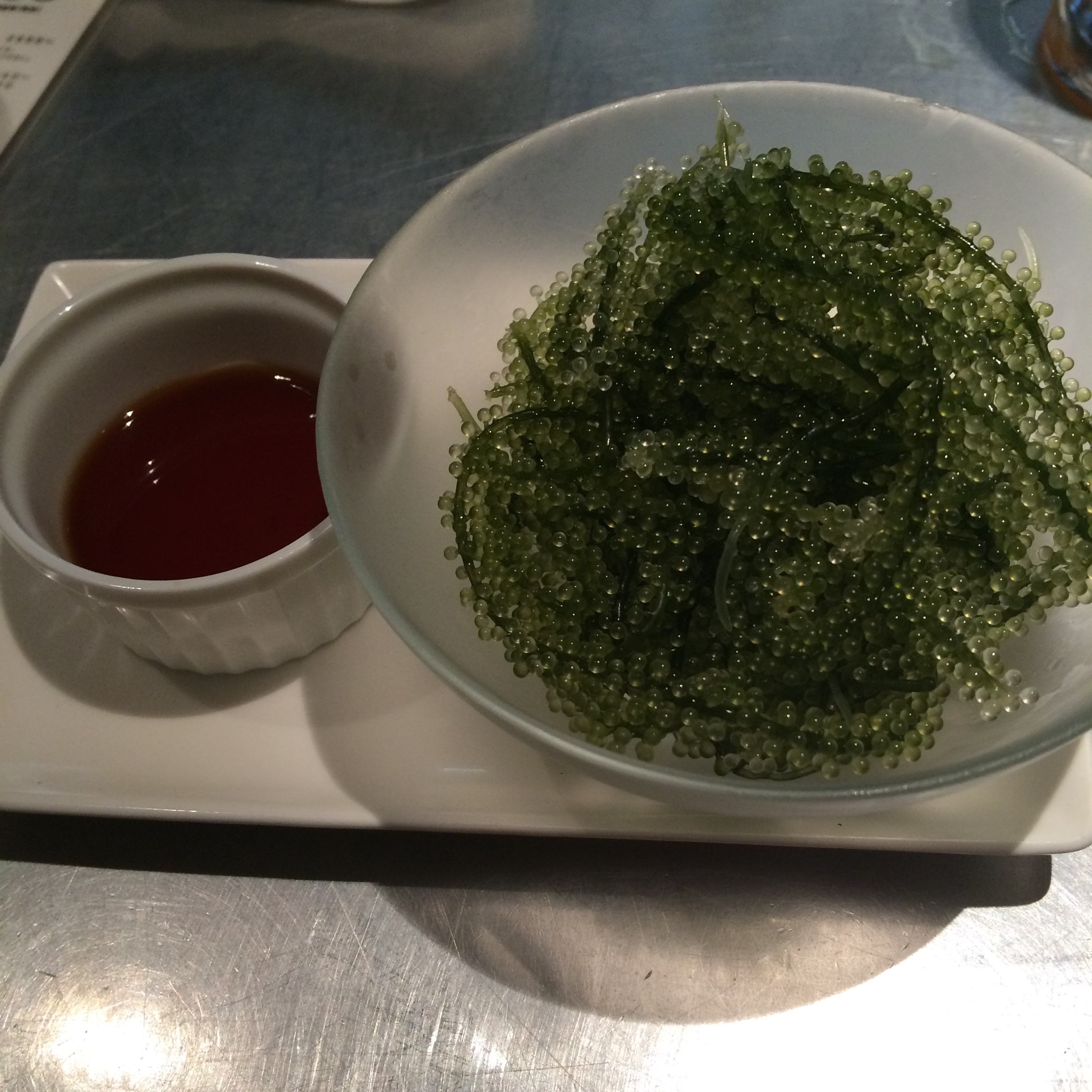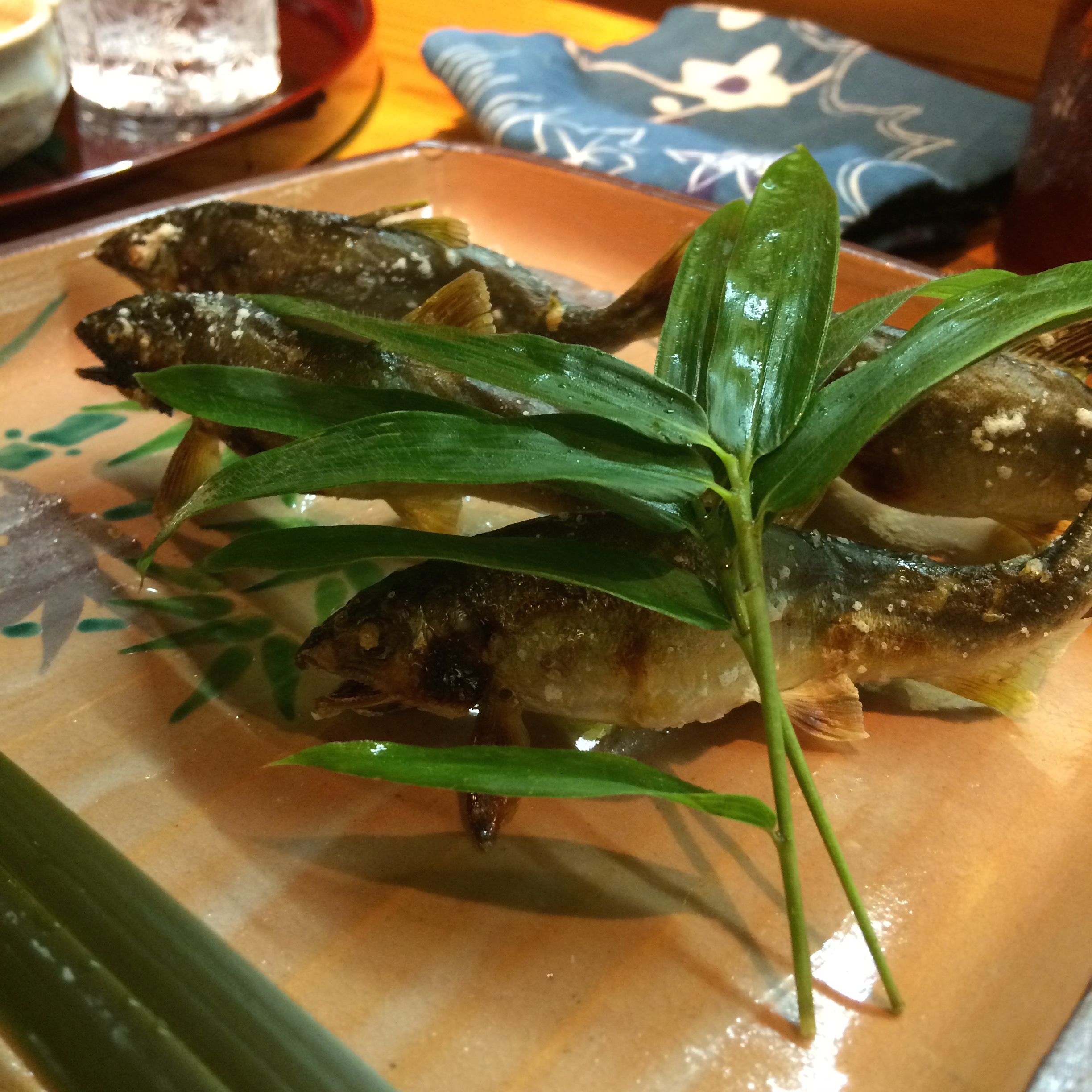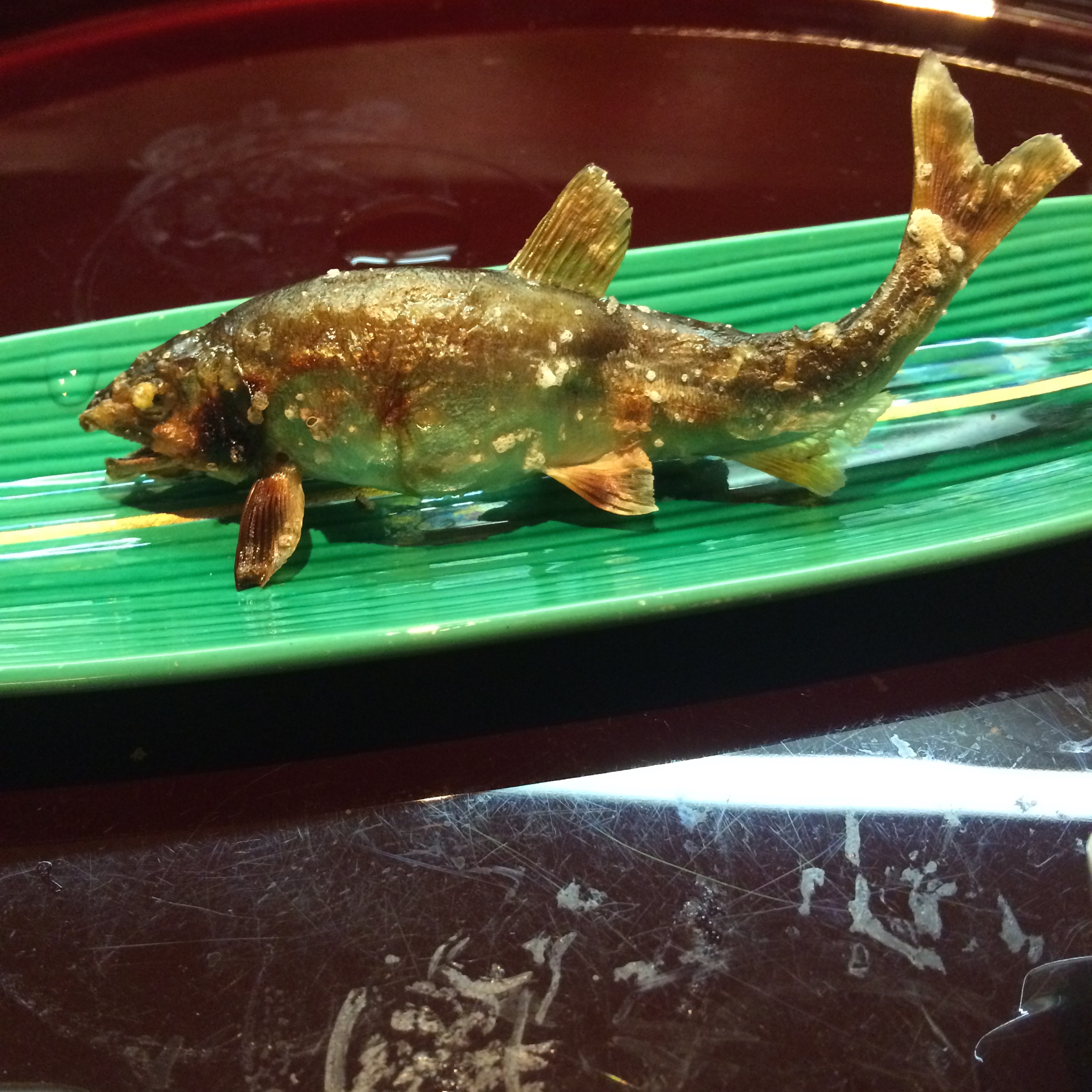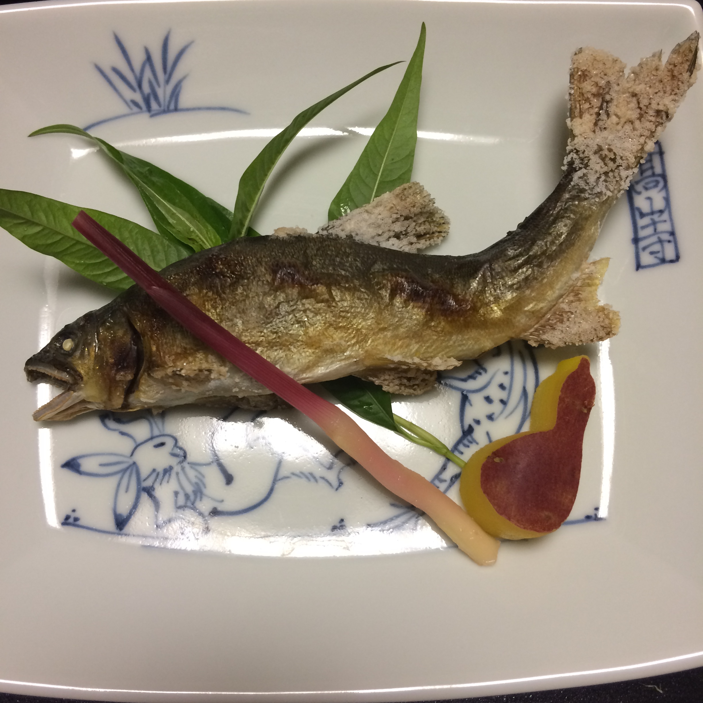 The 6th course was one that we had anticipated for a while because we watched it’s creation. A few courses before we saw one of the chefs holding live fish, and quickly skewering them and putting them into the oven to cook. I have to admit, I somewhat dreaded this course but honestly these sweet fish and the dipping sauce that came with it were pretty damn good.