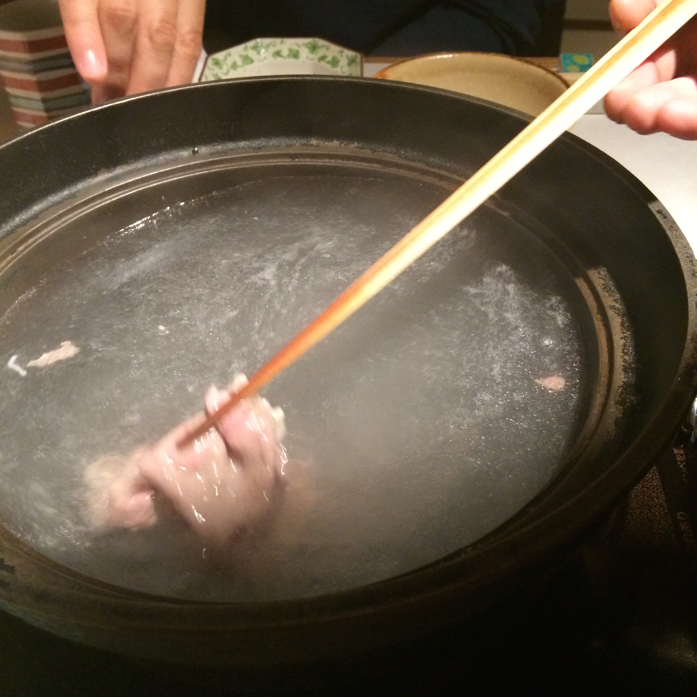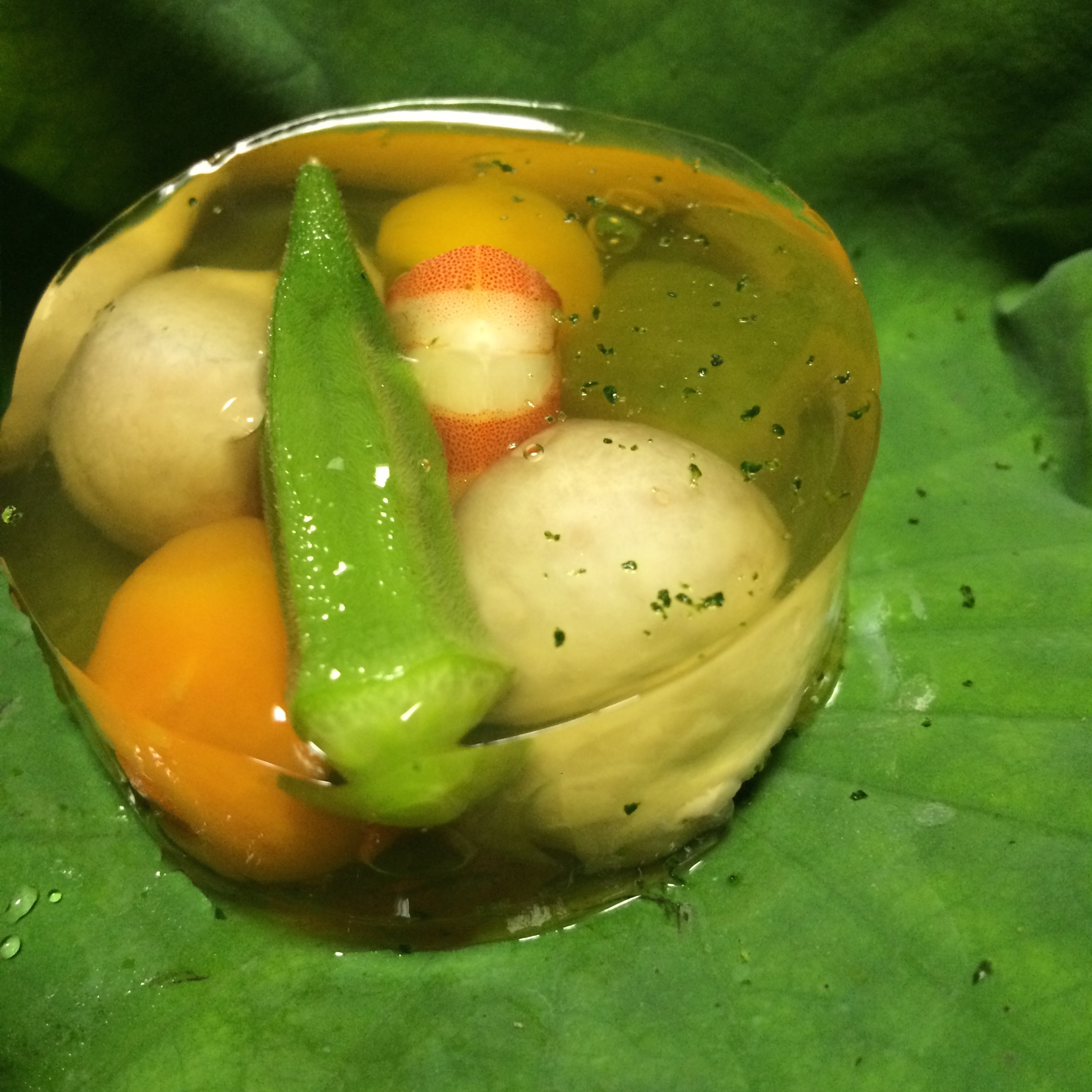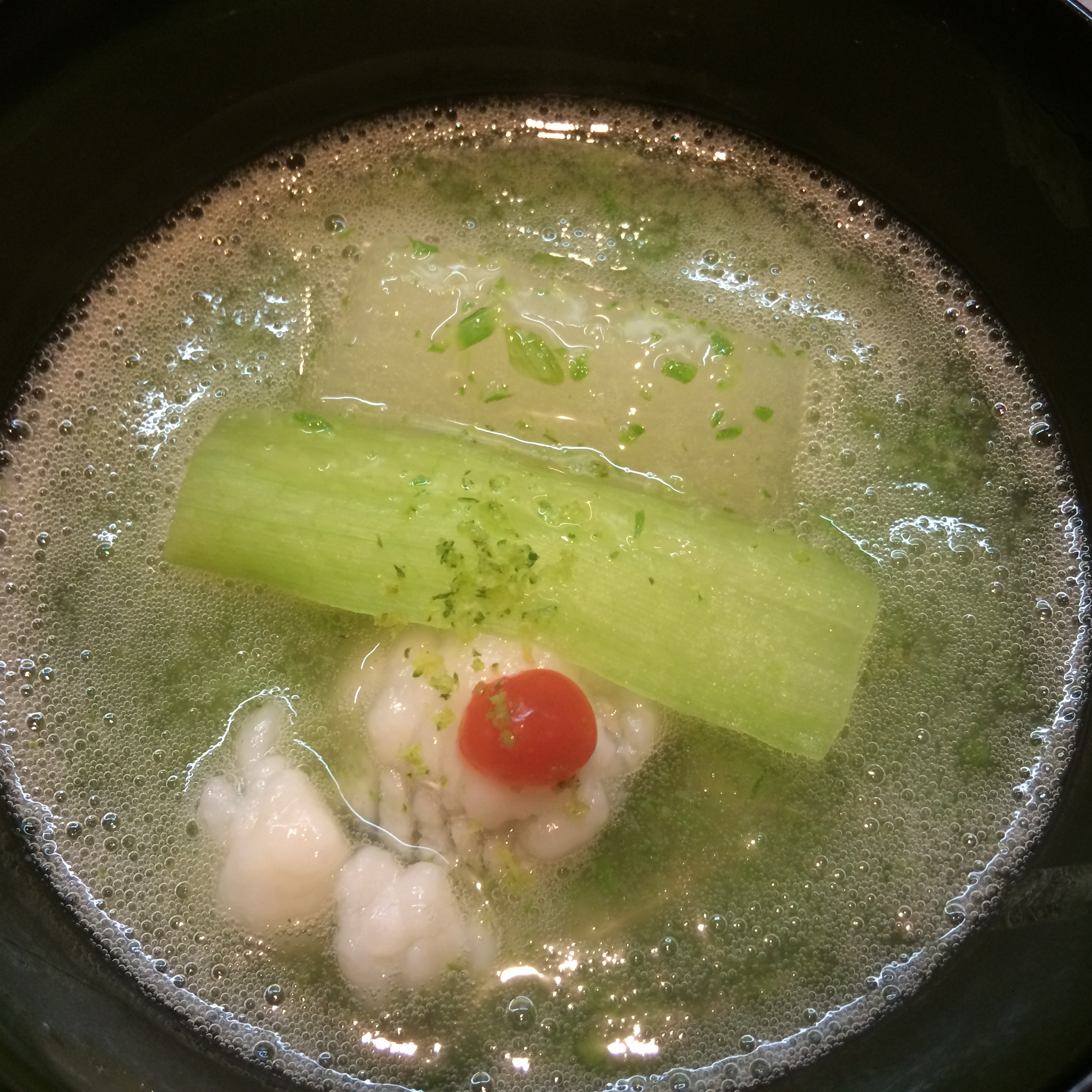 Next we had a soup made from okra, with sea eel (anago), celery and winter melon. Anago seems to be very common in Japan, and I like it so much better than unagi (fresh-water eel).