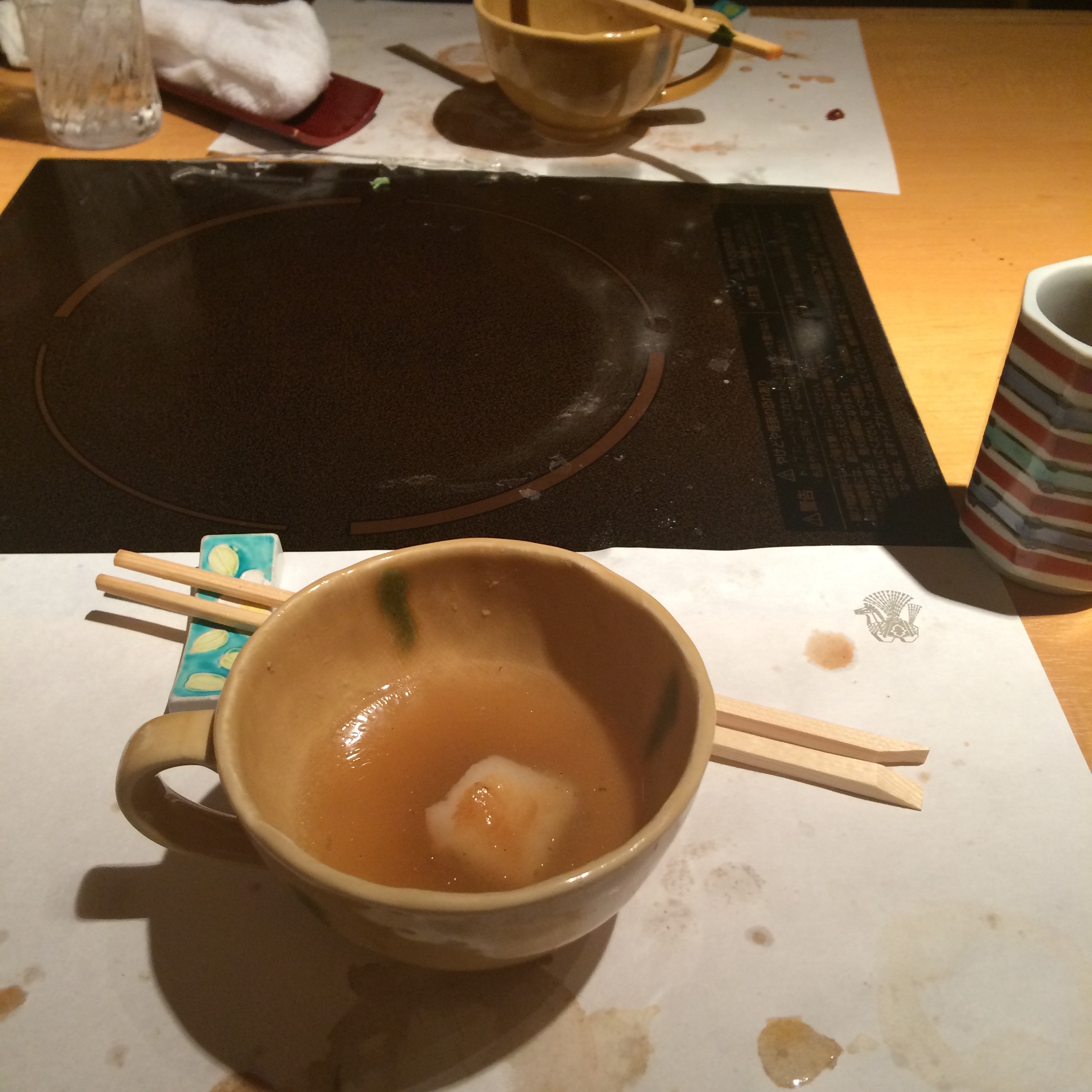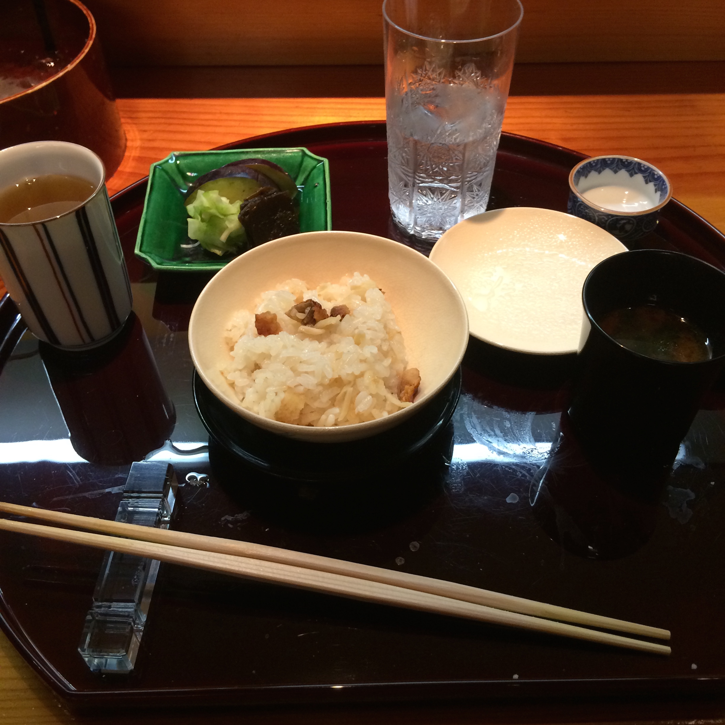 The last savory course was traditional – pickled vegetables (very big here), sticky rice with chestnuts (in season here in Japan), miso soup, and tea.