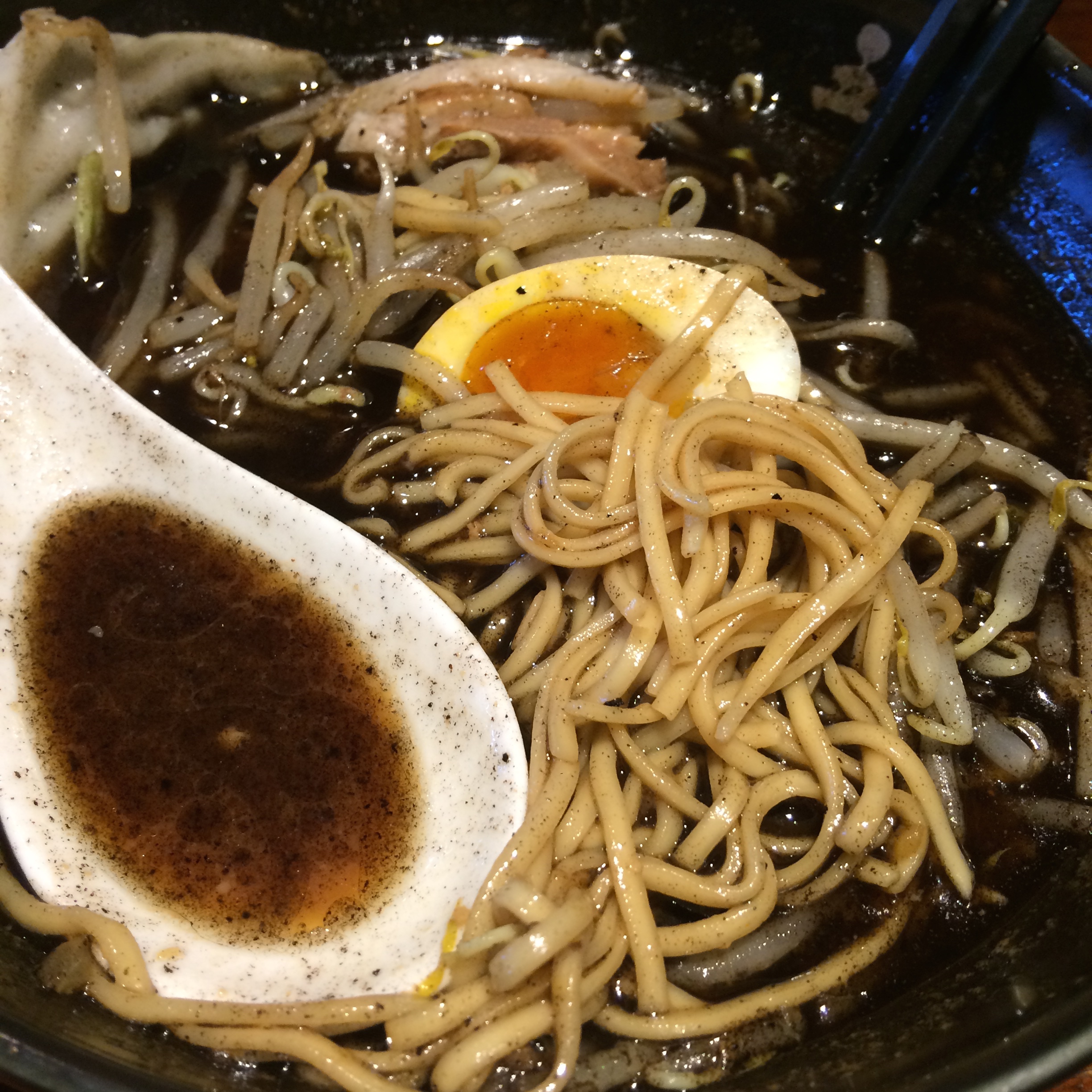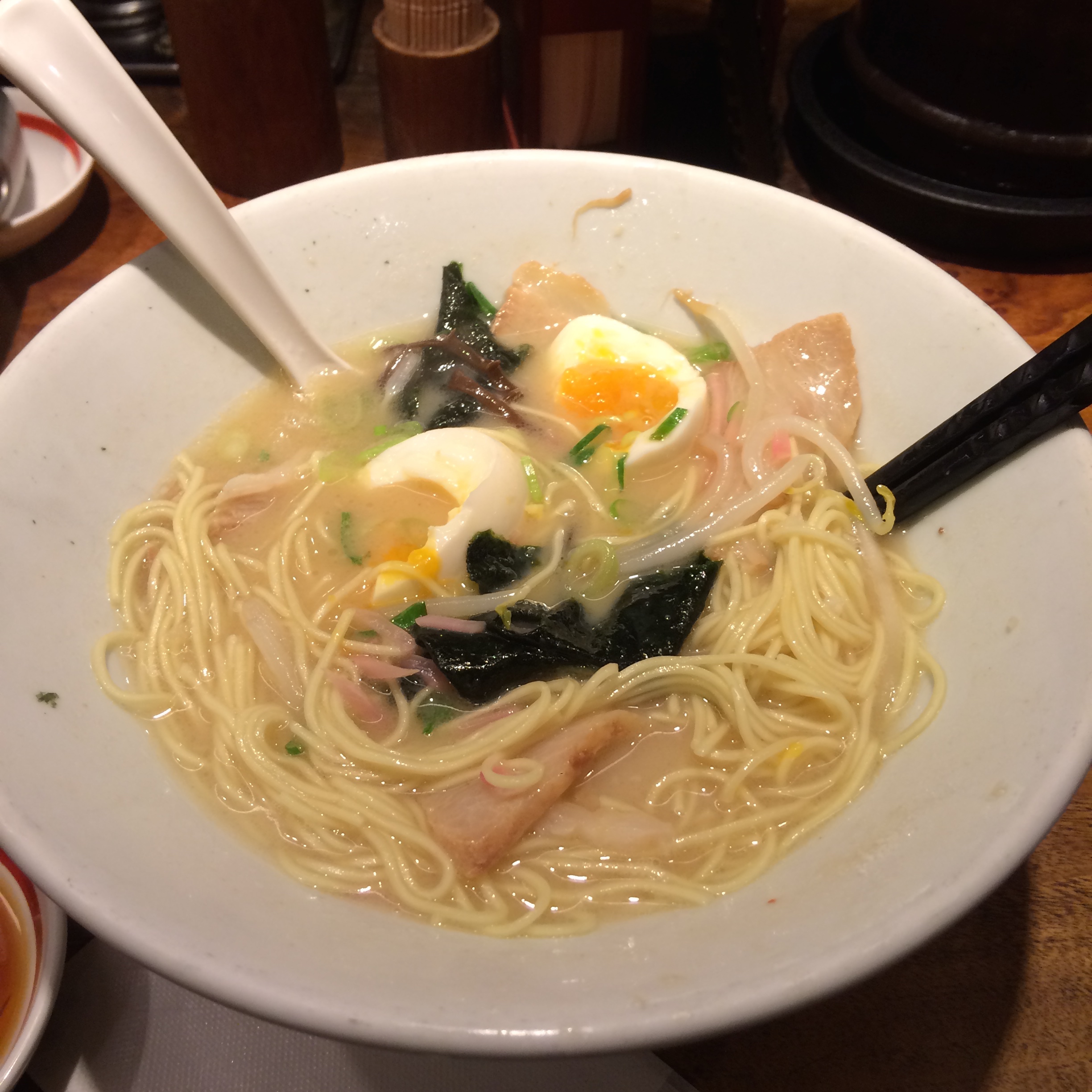 Another typical pork-filled meal, albeit not fried, is ramen. Now I’ve already talked about some of the ramen that I’ve had in Japan, but one additional place that deserves mentioning is Gogyo, which offers burnt-miso ramen (called kogashi), as well as the more typical sort. This burnt-miso broth is essentially made by scorching miso in lard…which is of course what gives it it’s intense flavor. The broth is dark in color, and looks almost as if it is charred. Sprouts, cabbage, nori, a fish cake, and some pork accompany this delicious bowl, plus I added an egg, because it’s what I do. I’ve never had a bowl of ramen quite like this, but I can’t recommend it more. It’s extremely rich and yet very hard to stop eating once you’ve started. If you find yourself in Japan (Tokyo or Kyoto) make sure you go to Gogyo!!
