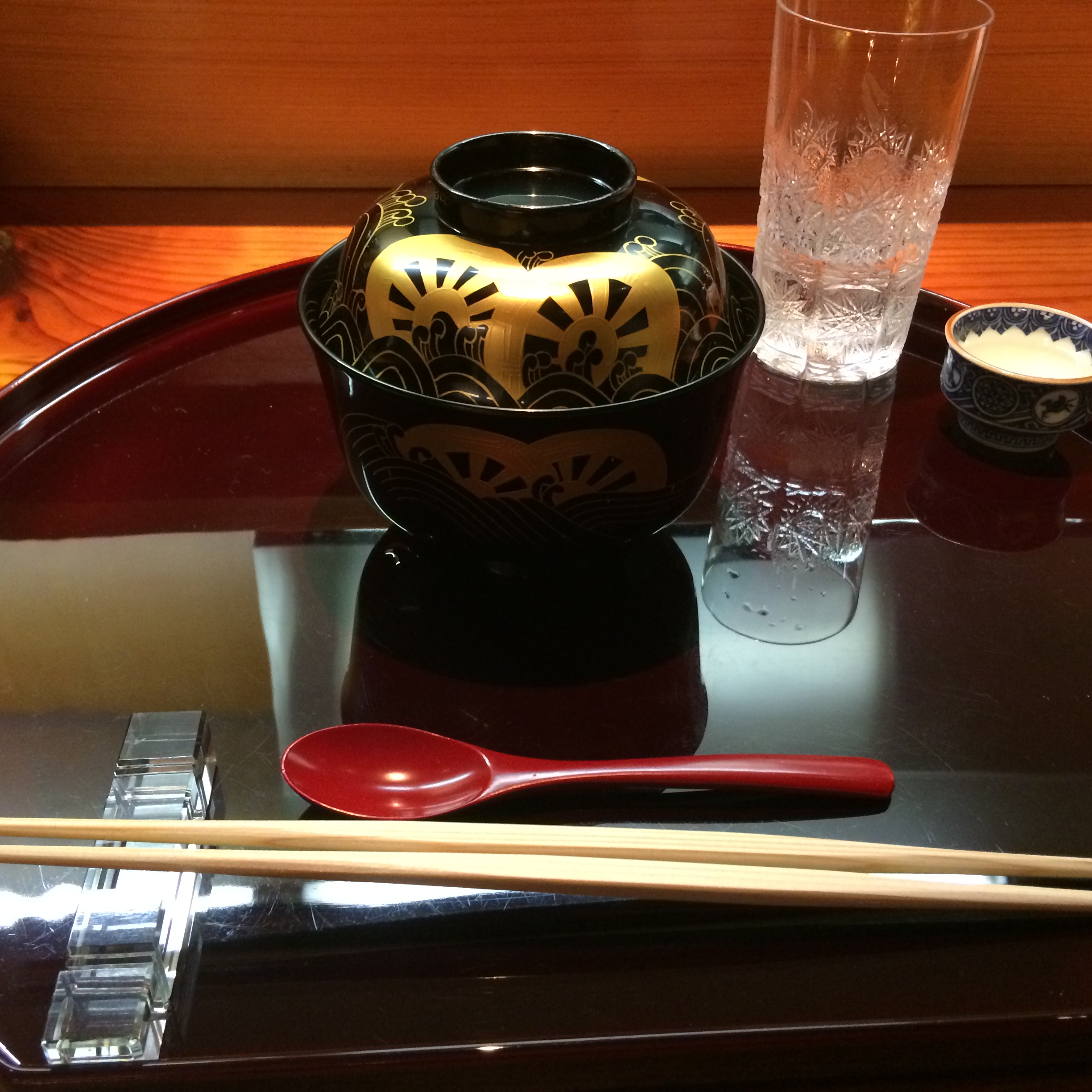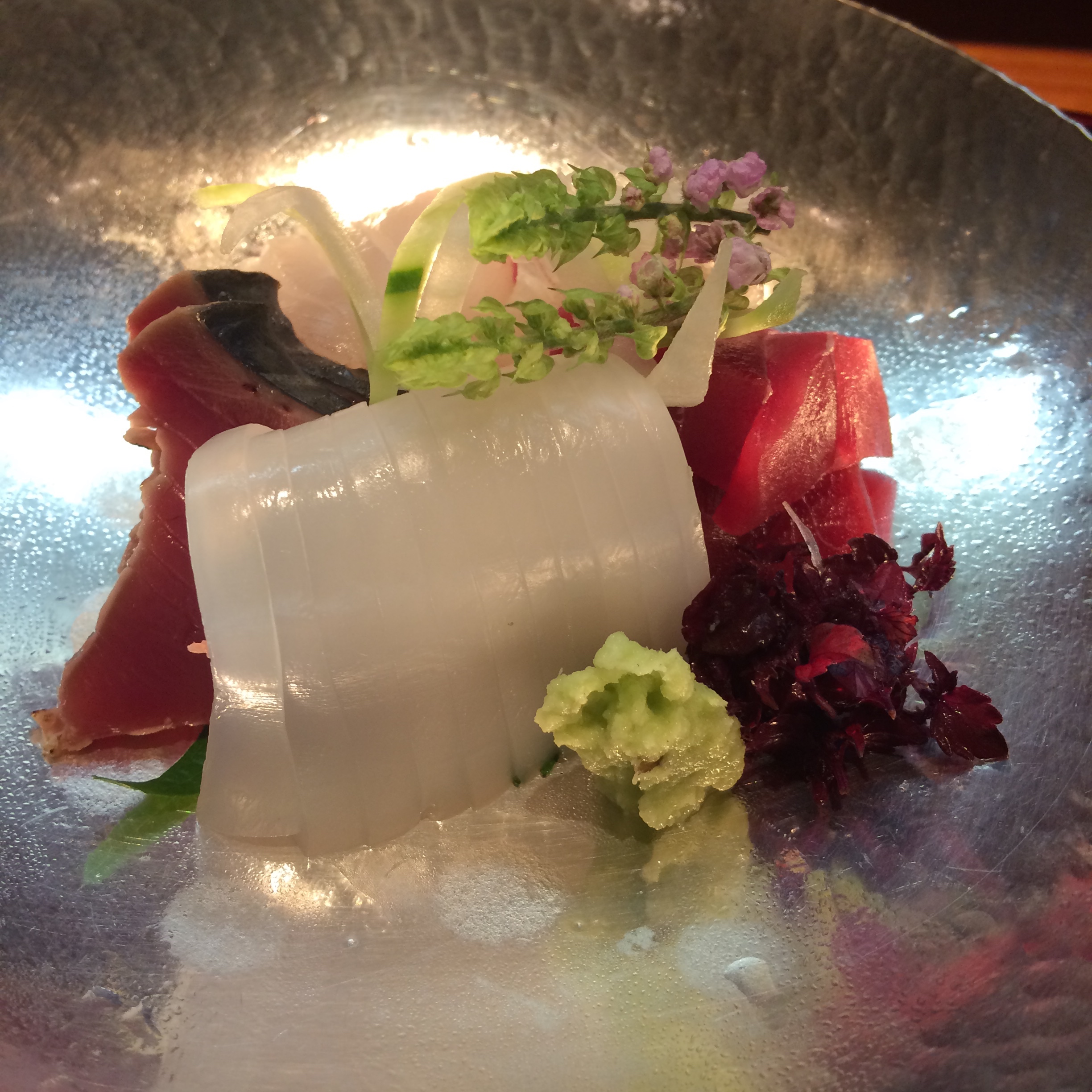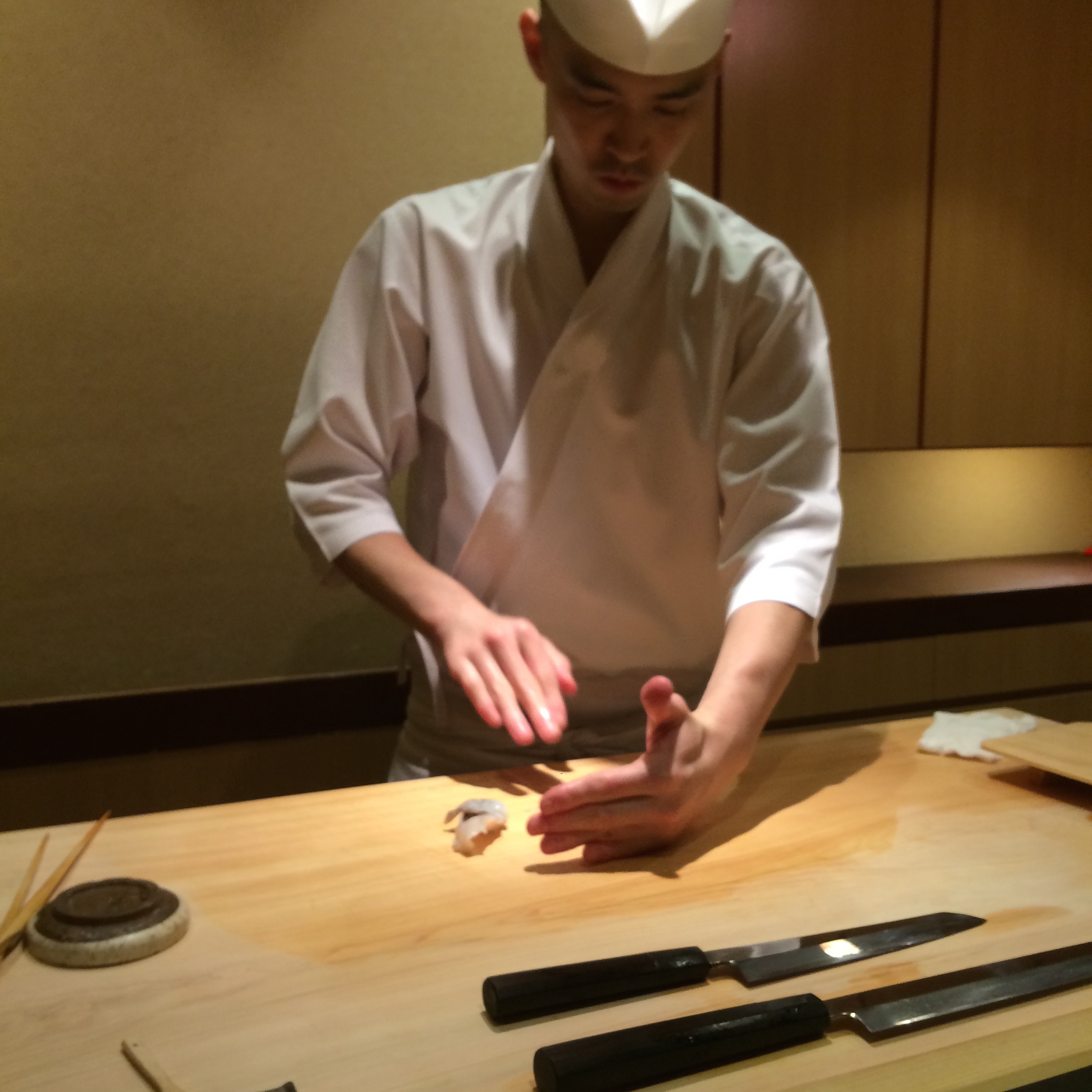 The third, and last, big sushi meal this week was at Aoyama Sushi Sen. This isn’t a place that you will read about in books or blogs, most likely, but was a place that my brother had been taken to by friends a couple of months ago. He hit it off with the chef the first time around, so today’s experience was a lot of fun! Chef Keiichirou talked to us throughout the entire lunch, mostly about baseball, which is what he and my brother had bonded over previously, but also about LA, and my trip to Japan in general. The squid at Sen was definitely the best I’ve had in Japan (great flavor and texture – less chewy than the rest I’ve had), and the bonito had a really amazing smoked flavor, different than the other pieces of bonito I’ve had on this trip. 8 seats at the bar, plus a few tables, this is another really intimate sushi experience. Keiichirou made our entire meal directly in front of us (perfect for pictures) and presented each piece on traditional Edo kiriko cut glass. This was a great way to finish up the sushi portion of my trip. The fish was fantastic, and Keiichirou was a lot of fun, which made the experience of dining with him one that is hard to find as a traveler here in Japan…thank God Michael had already warmed him up prior to this visit 🙂