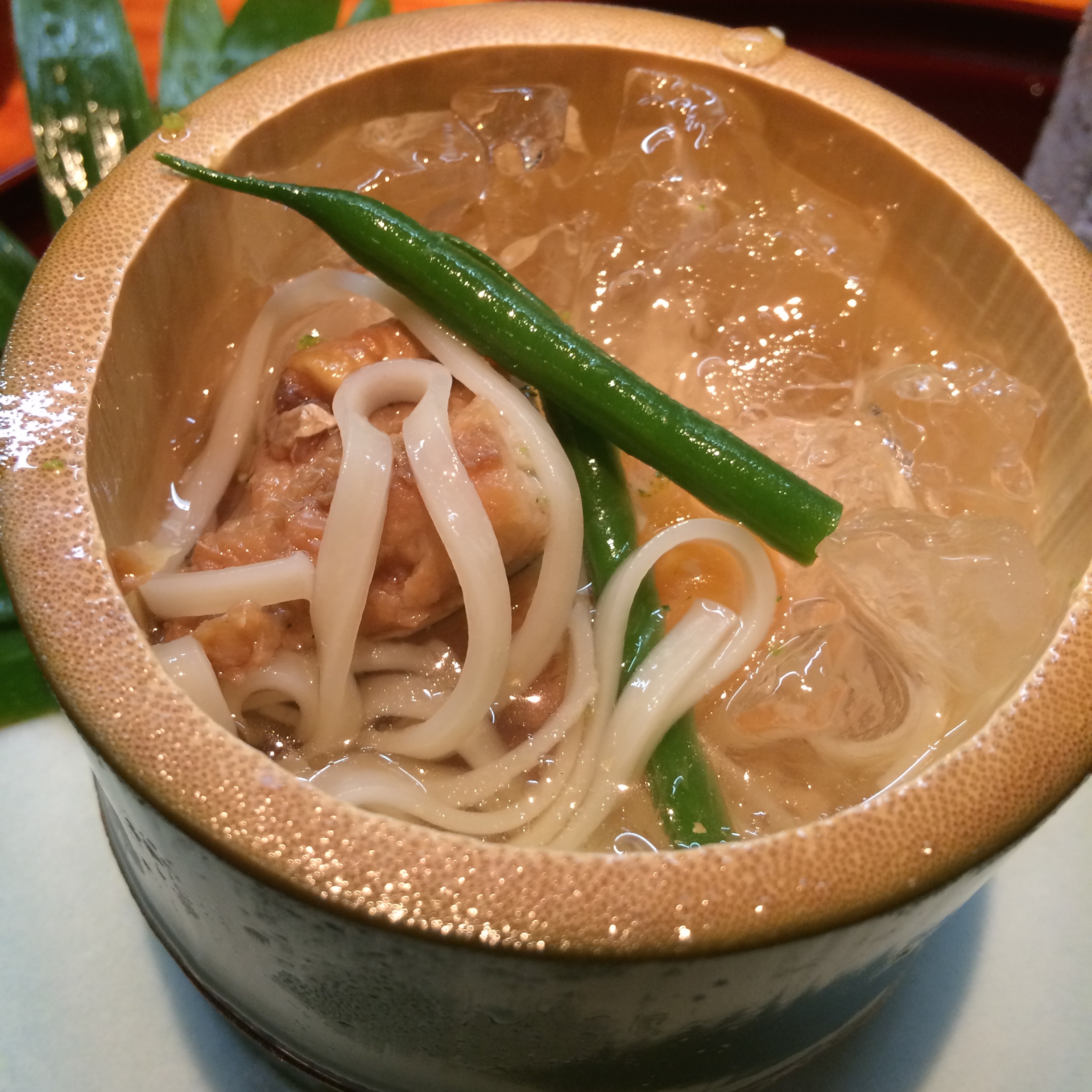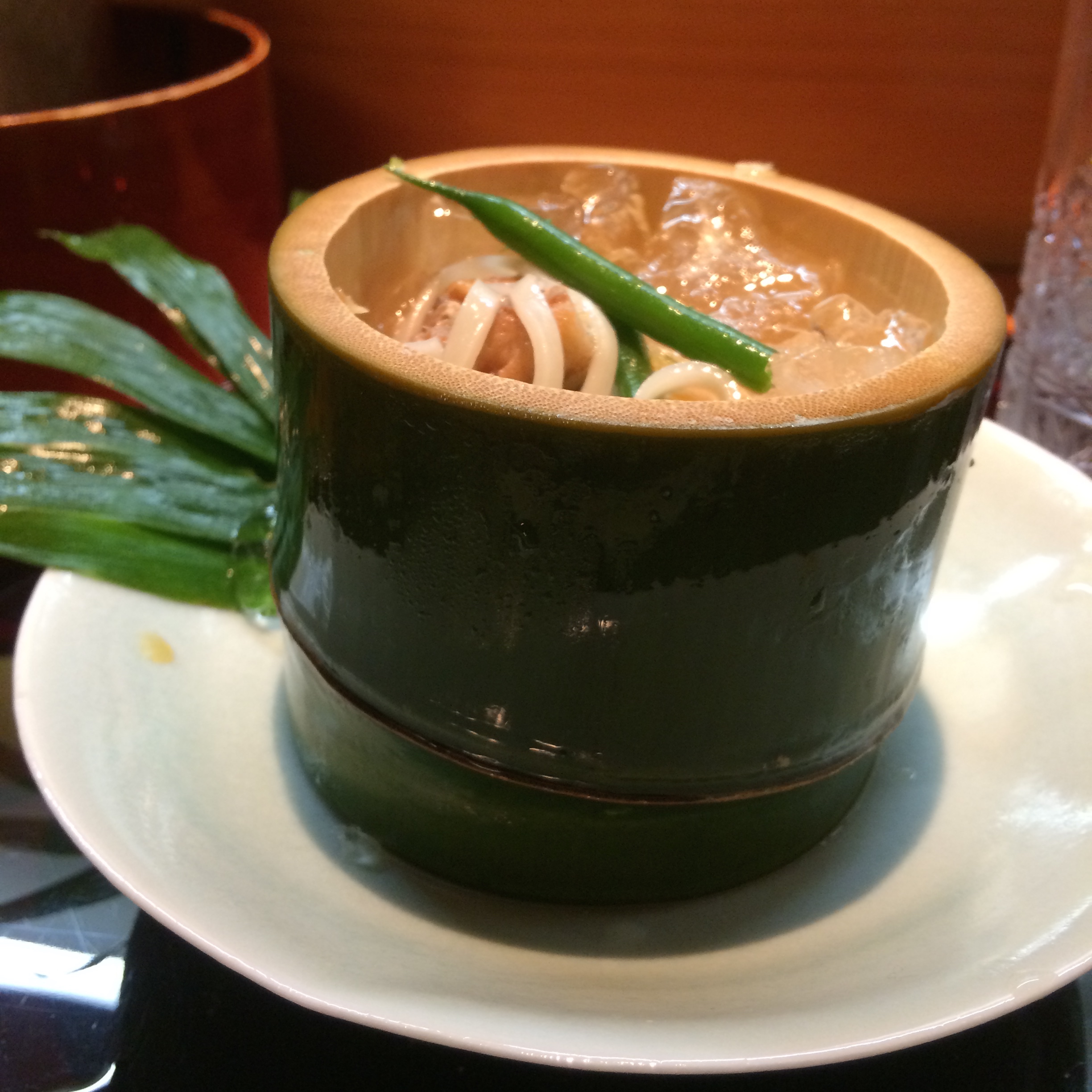 Next up, served in bamboo, were fresh noodles with sea bean, abalone, and an egg. Noodles etc. were to be removed from their ice bath, plunged into the dipping sauce of soy sauce and sesame seeds and eaten.