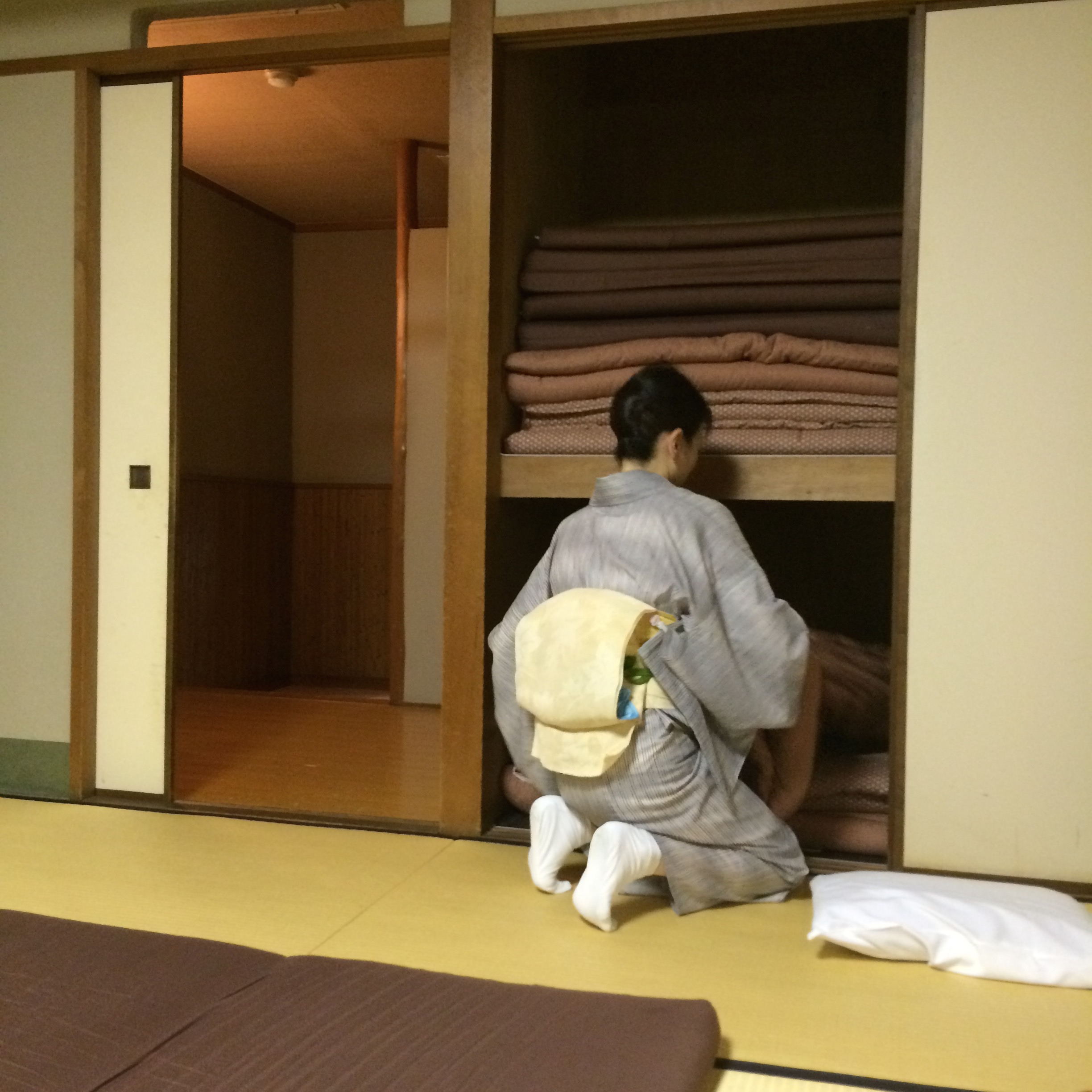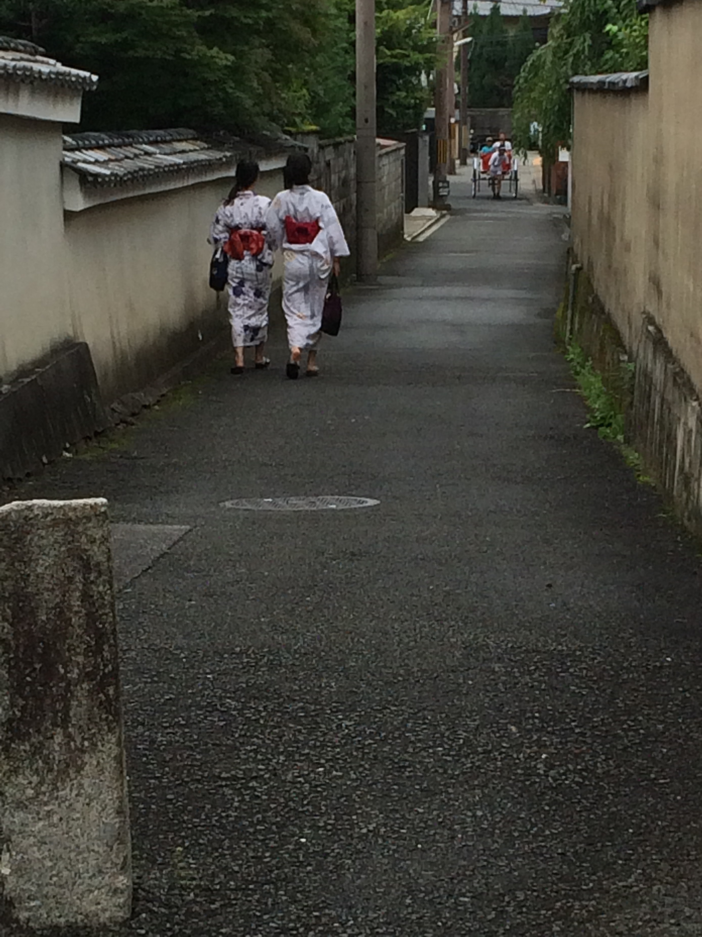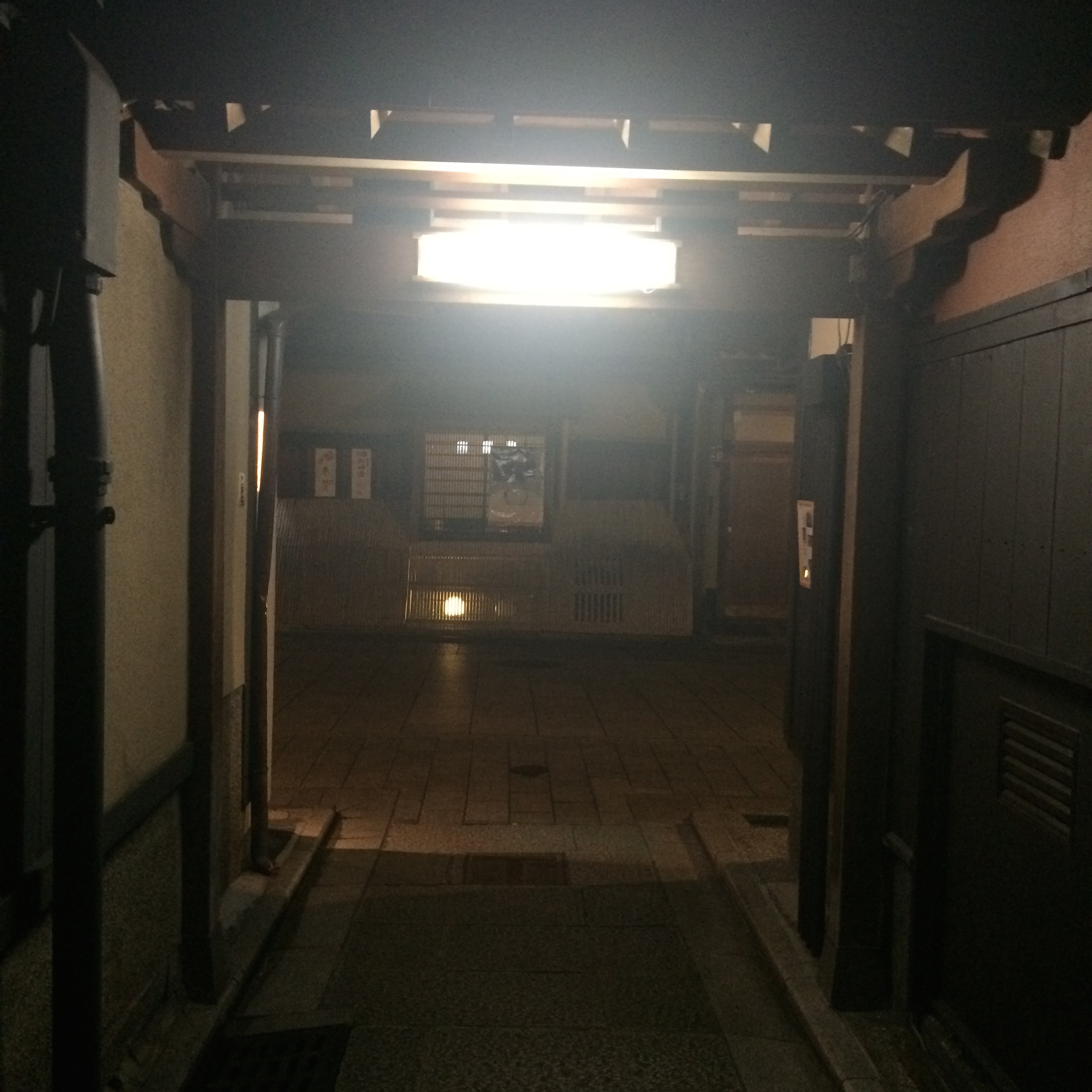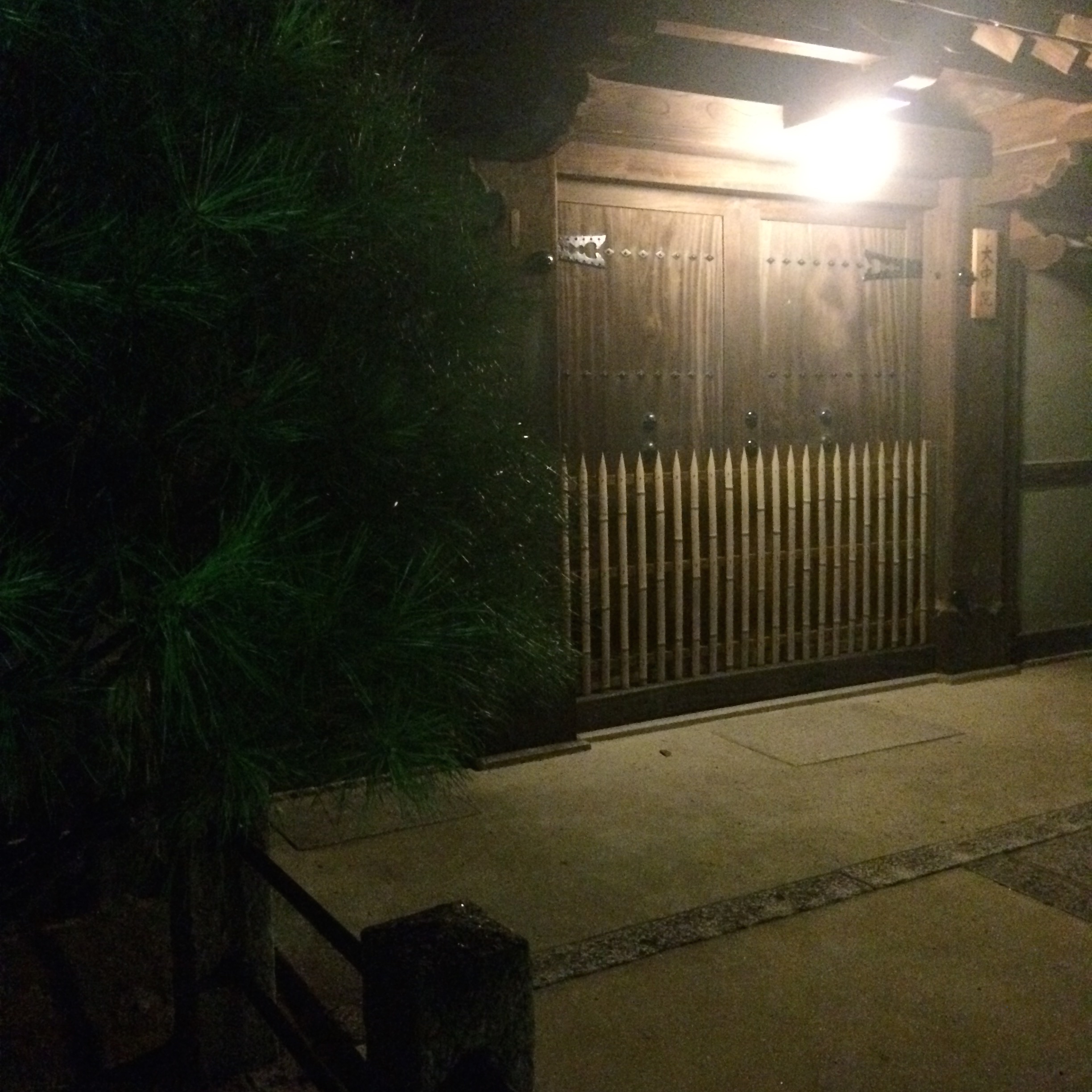 This dinner was a traditional kaiseki meal in the Geisha district of Kyoto – Gion. This area looks straight out of a movie – tiny alley-like streets, nondescript building facades with lit lanterns telling you that they’re open. It took us a couple tries to find the right place (remember these signs aren’t in English!), but with a little help we got there. We slid open the wood door and were met by our hostess and waitress for the night, in full traditional kimono.