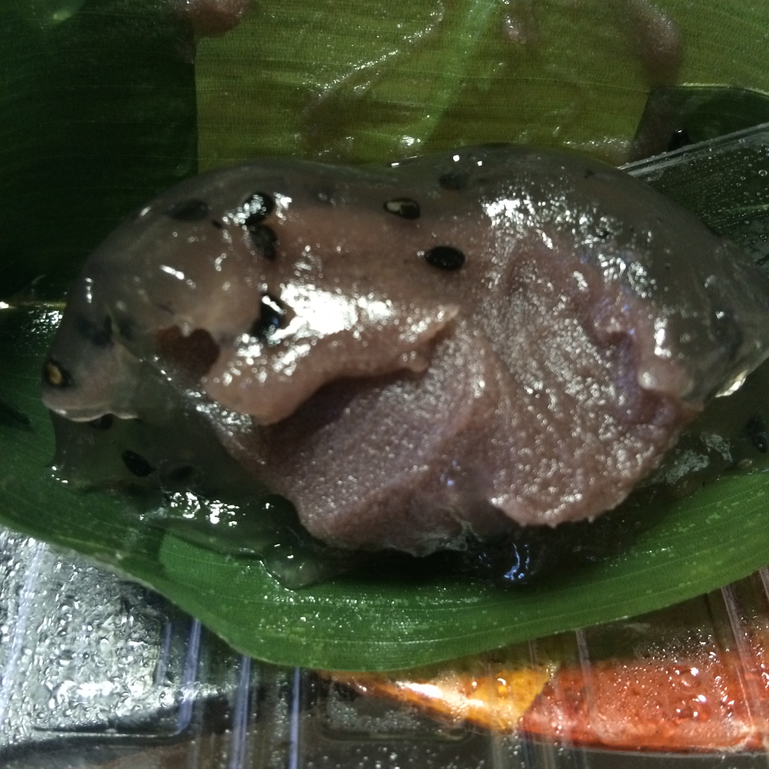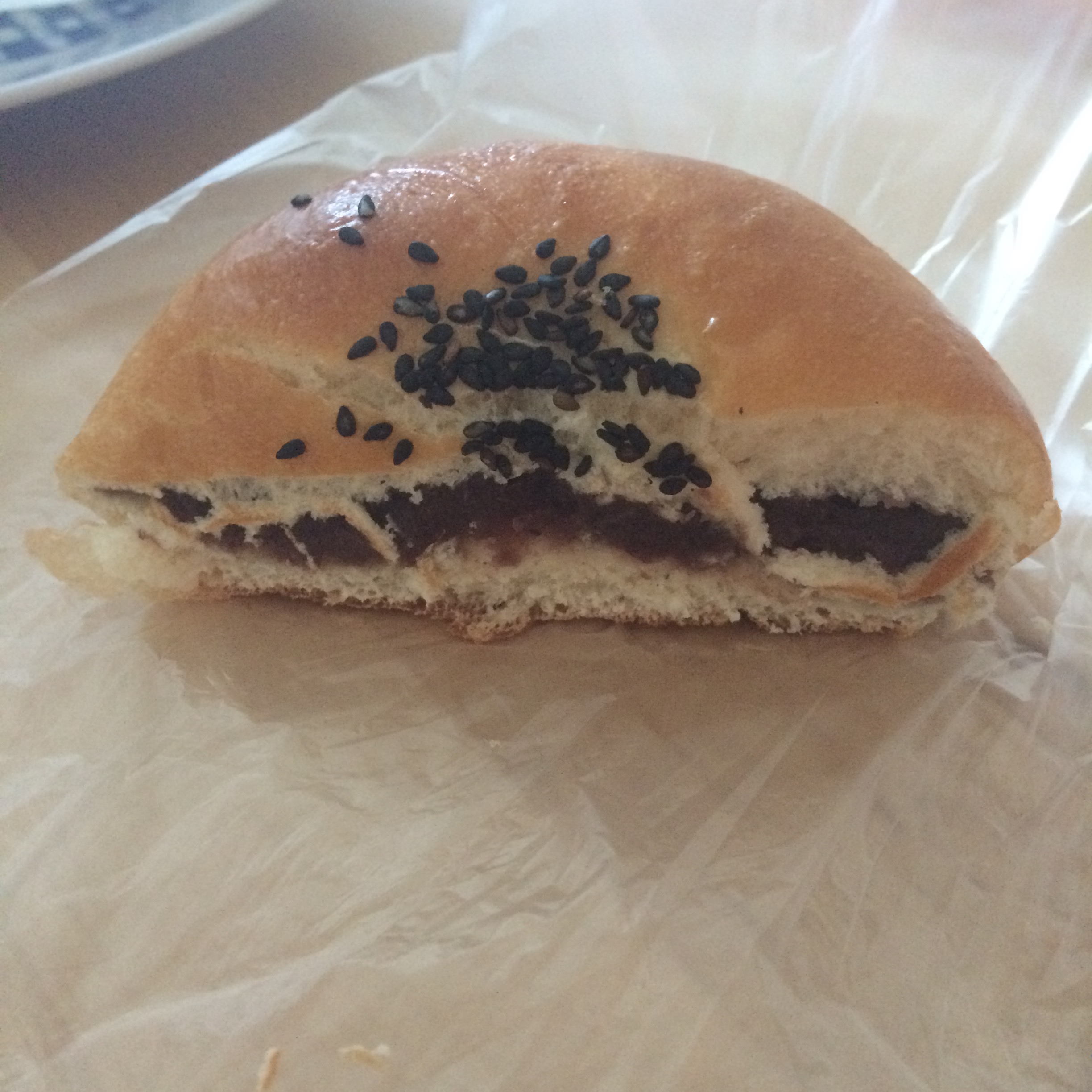 Peanut butter sandwich, sold in markets and convenience stores. The bread is sealed around the edges, there’s a cute little peanut embossed on the bread (not sure if it’s legible in the picture), and it’s filled with deliciously sweet PB. This felt more dessert than lunch sandwich to me, but such a great treat! Thanks to Logan for the hot tip on this.