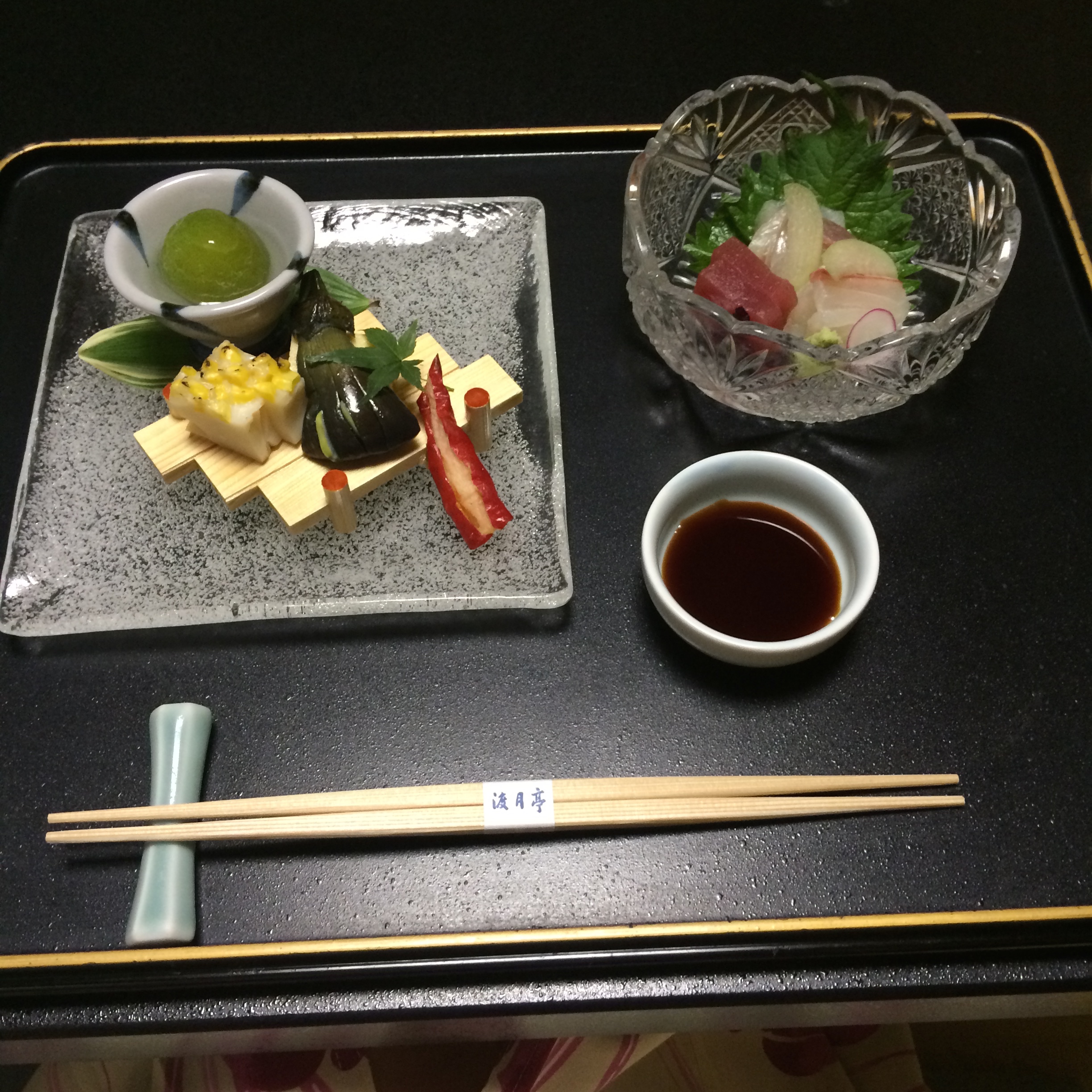 Kaiseki desserts end with a “dry” sweet, which in this case ended with a  twist on mochi, which is all over Kyoto. This was a homemade sweet corn mochi, served warm. It’s been a couple of days since this meal and I’m still thinking about this really unique dessert. I wish it was more commonplace so I could go buy some at the market here – that corn flavor was creamy and perfect.