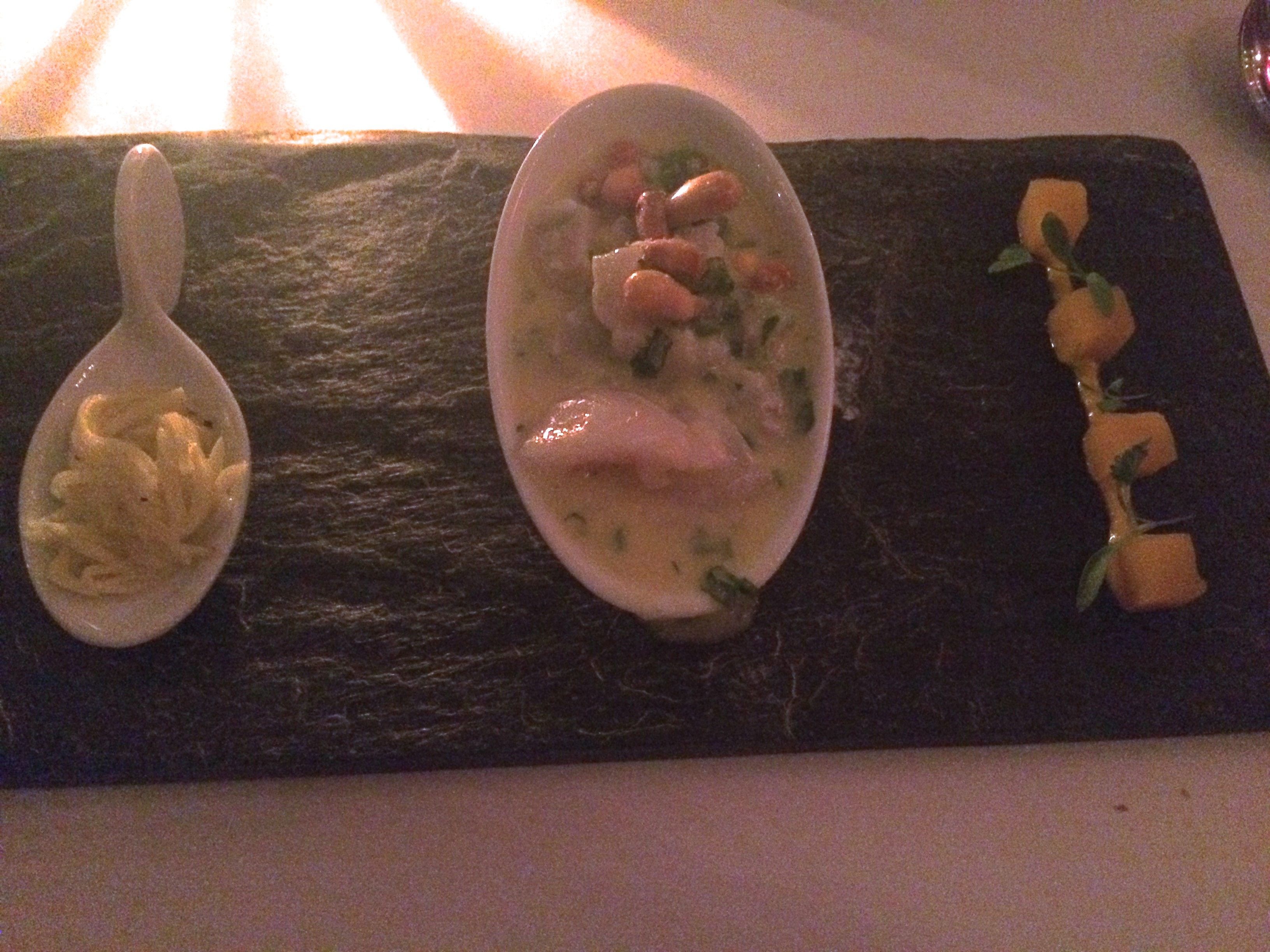 Ceviche with whitefish, lychee, coconut, roasted Peruvian corn, accompanied by butternut squash and green mango. After eating the ceviche with the butternut squash you then drink the remaining juice, or leche de tigre, and then finish it off with the spoonful of green mango on the left. Best dish of the night (and worst photo)!