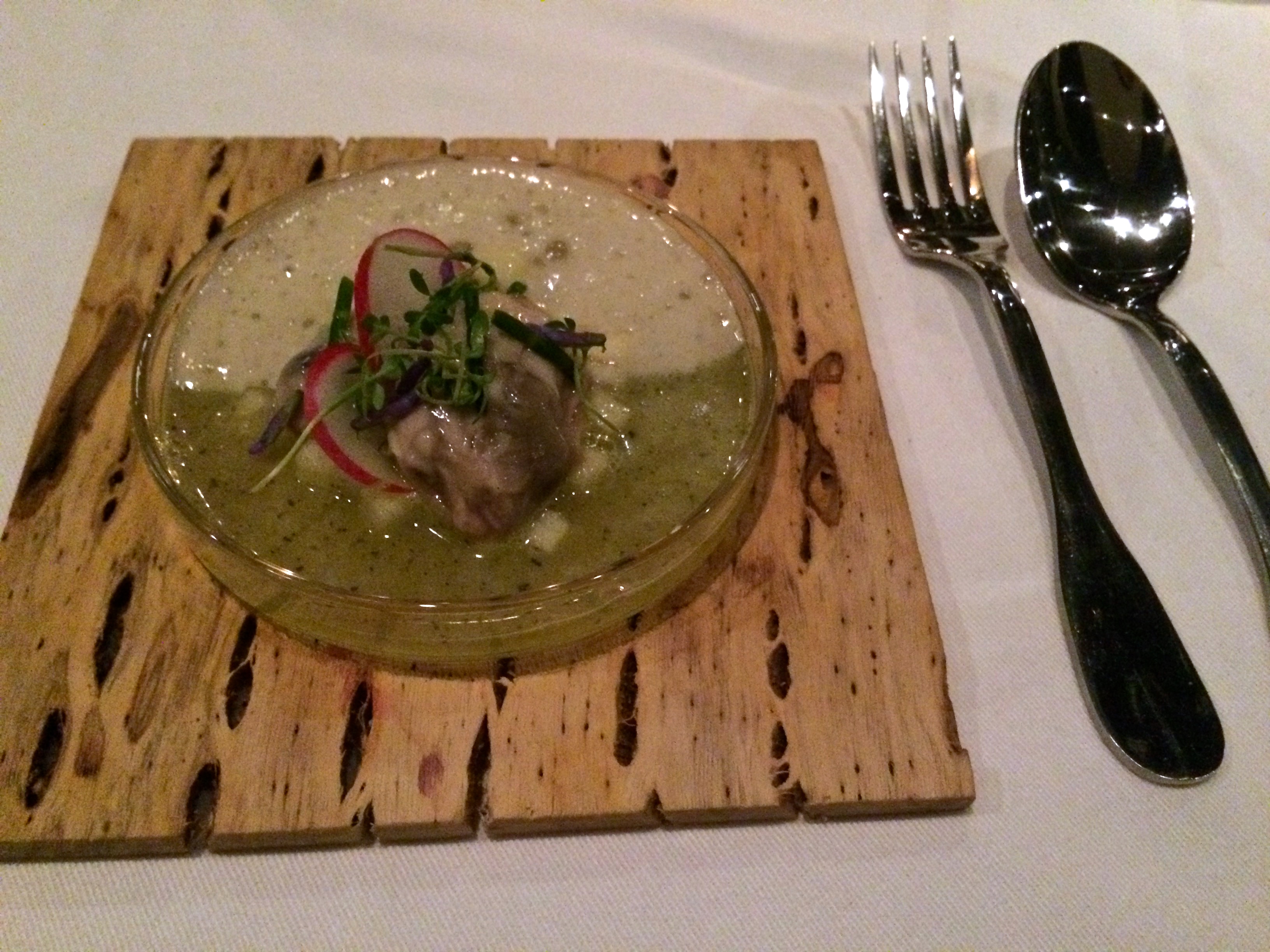 Oyster with radish, green apple, fresh seawater and fresh apple juice which was poured out of a beaker tableside.