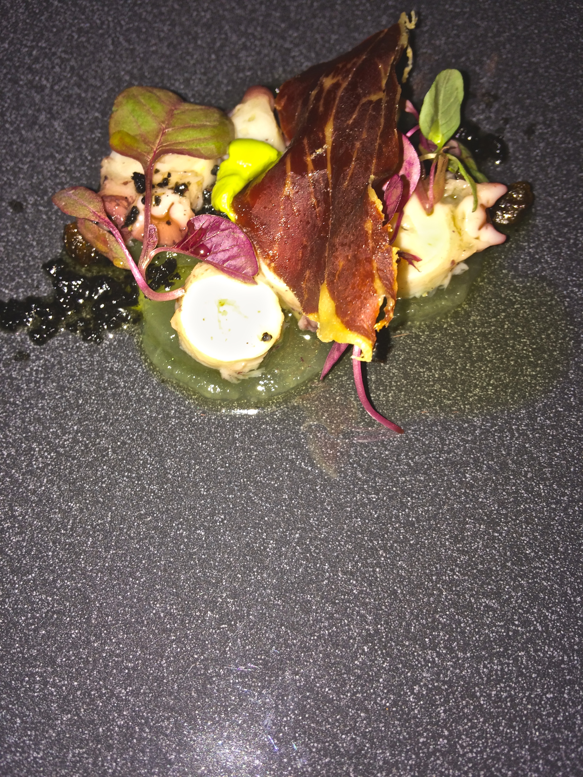 Octopus confit w/oo, avocado, crispy ham, capers, melon (Probably my favorite dish, and yet again the worst photo!!)