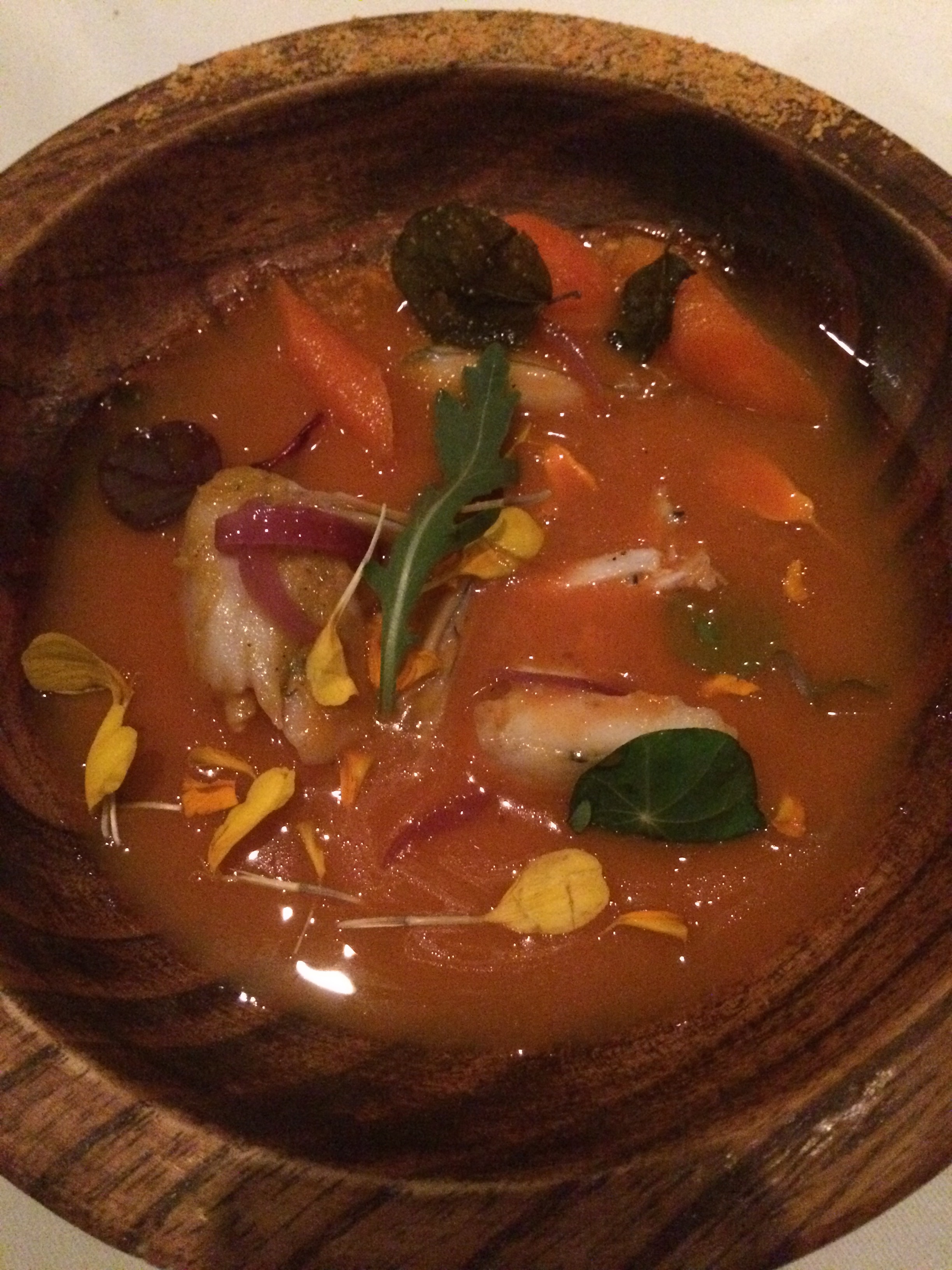Pickled frog with carrot, ginger, nectarine soup – The soup was delicious, but I could’ve done without the frog unfortunately.