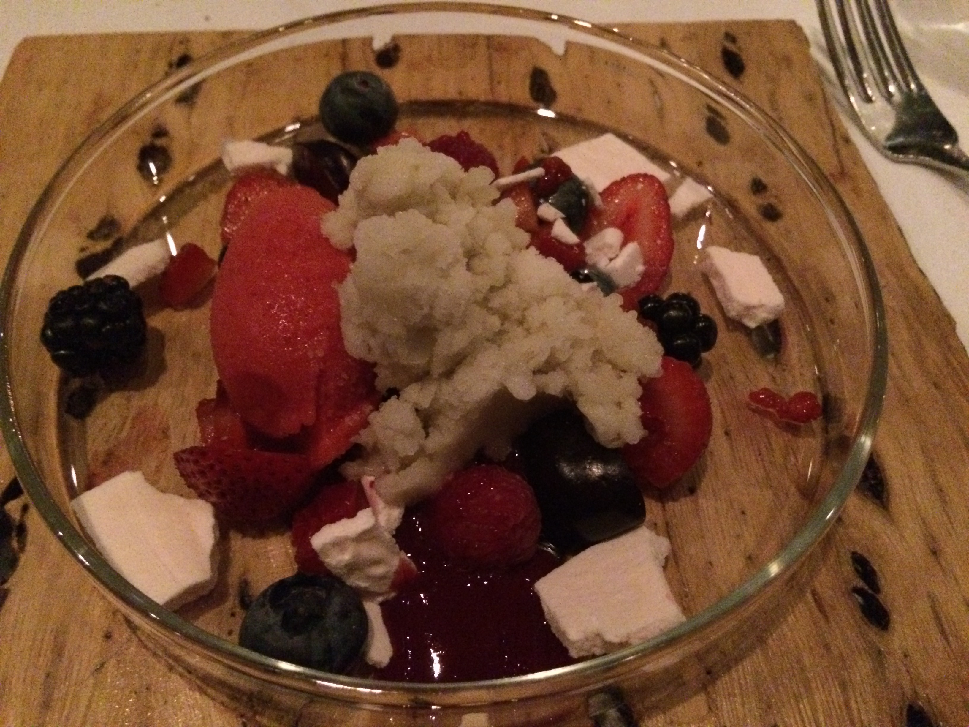 Berries w/strawberry sorbet, bourbon sorbet, eucalyptus marshmallow, meringue. The marshmallow was awesome! The perfect refreshing dessert after I was really starting to feel it from all those courses.