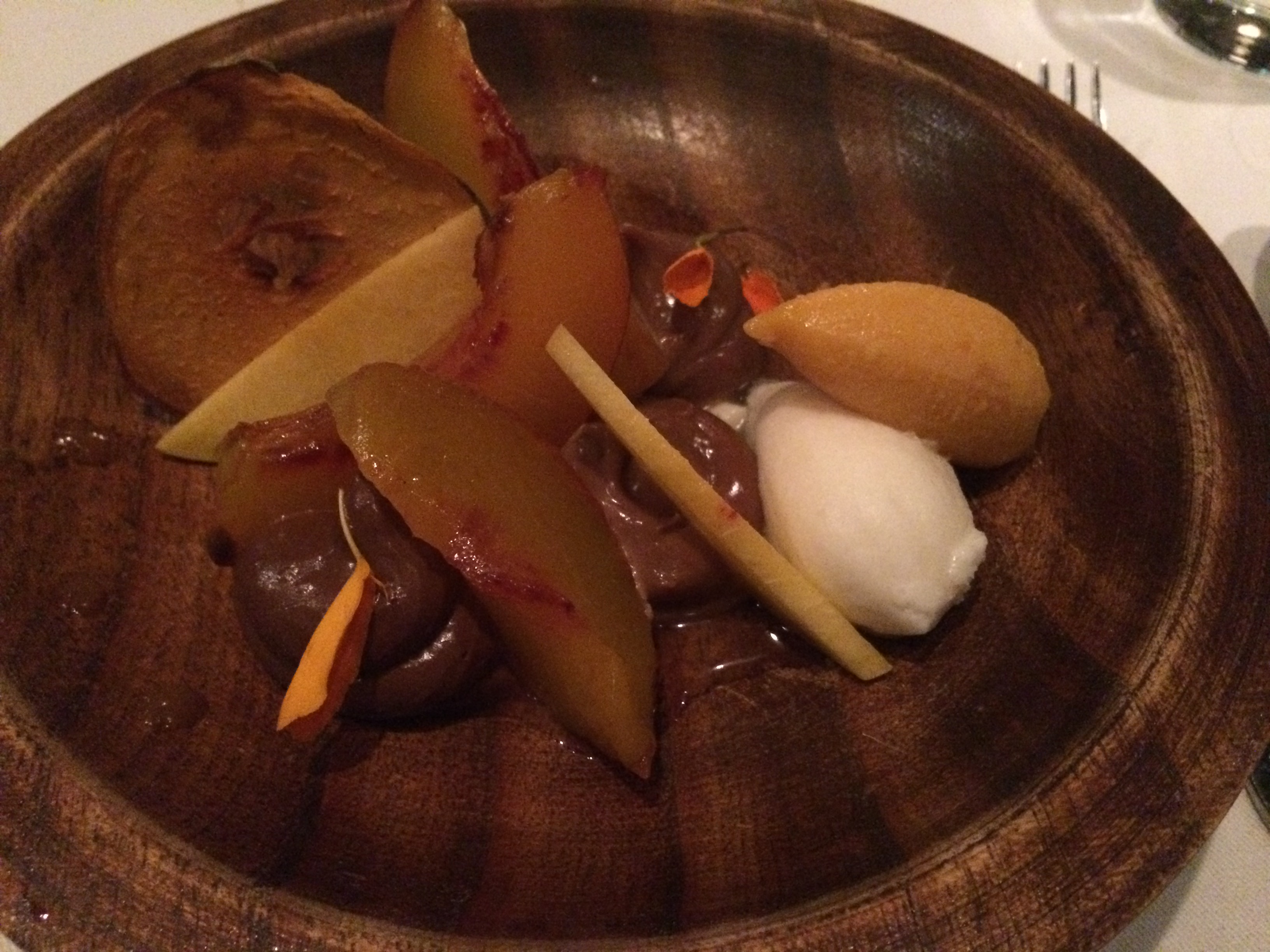 Stone fruit with chocolate mousse, vanilla syrup, yogurt ice cream, peach ice cream. The yogurt ice cream and chocolate mousse were fantastic.