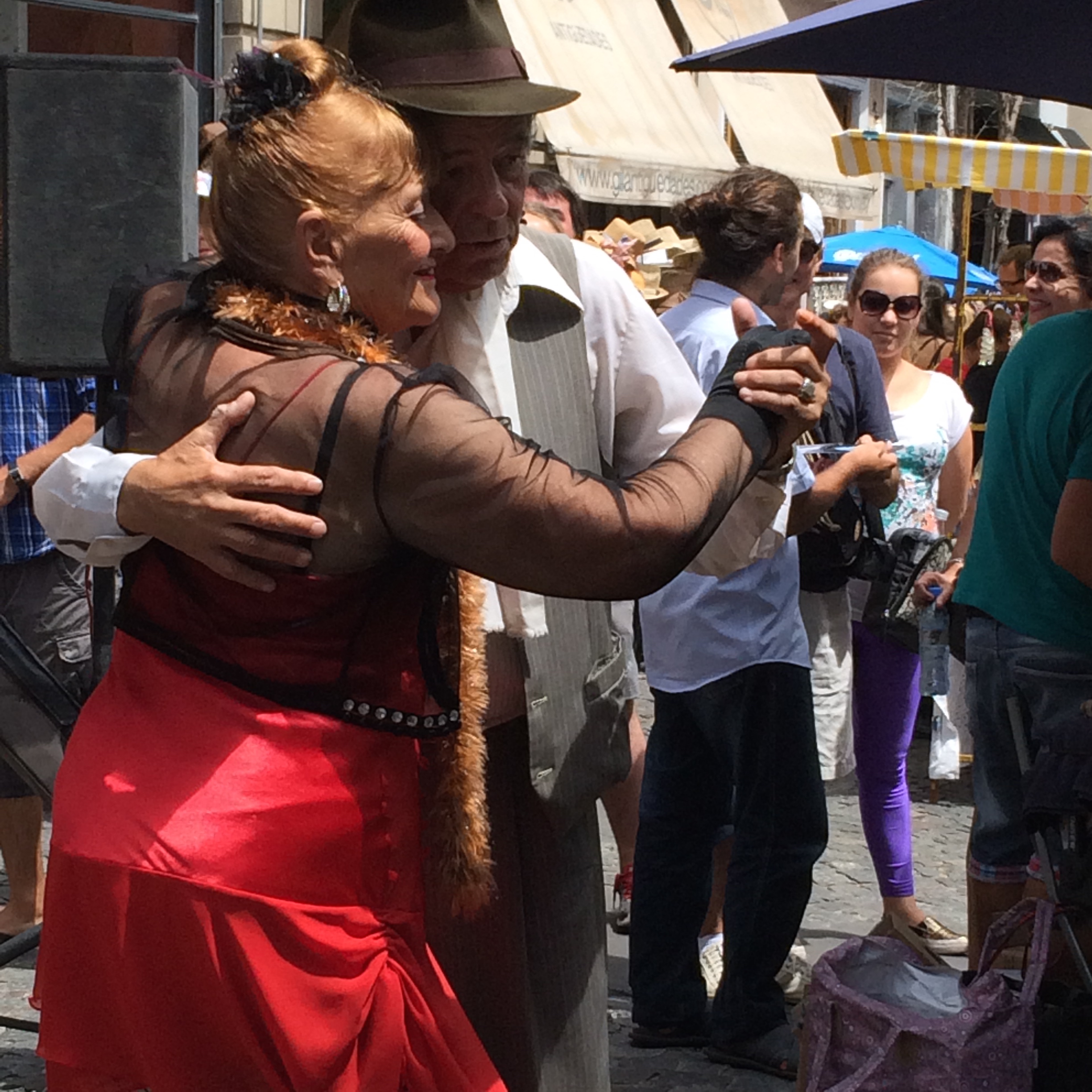 On Sundays the area of San Telmo, one of the oldest barrios in the city, has a big market. Antiques and other goods line the cobblestone streets, tourists come out in droves, locals bring their mate gourds, there are public asados (read: BBQs) being held, guys squeezing fresh OJ and selling empanadas, tango dancers and musicians performing.